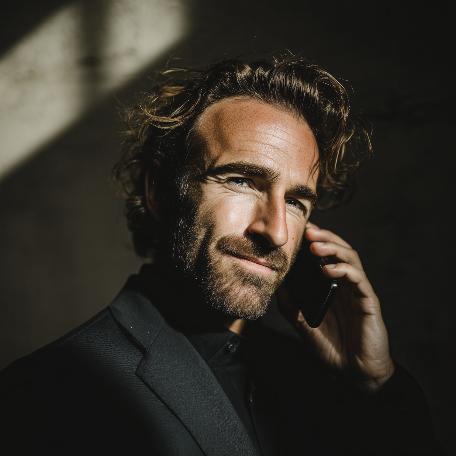 Close-up of a man in a black suit, holding a phone to his ear, with dramatic lighting highlighting his face against a dark background.