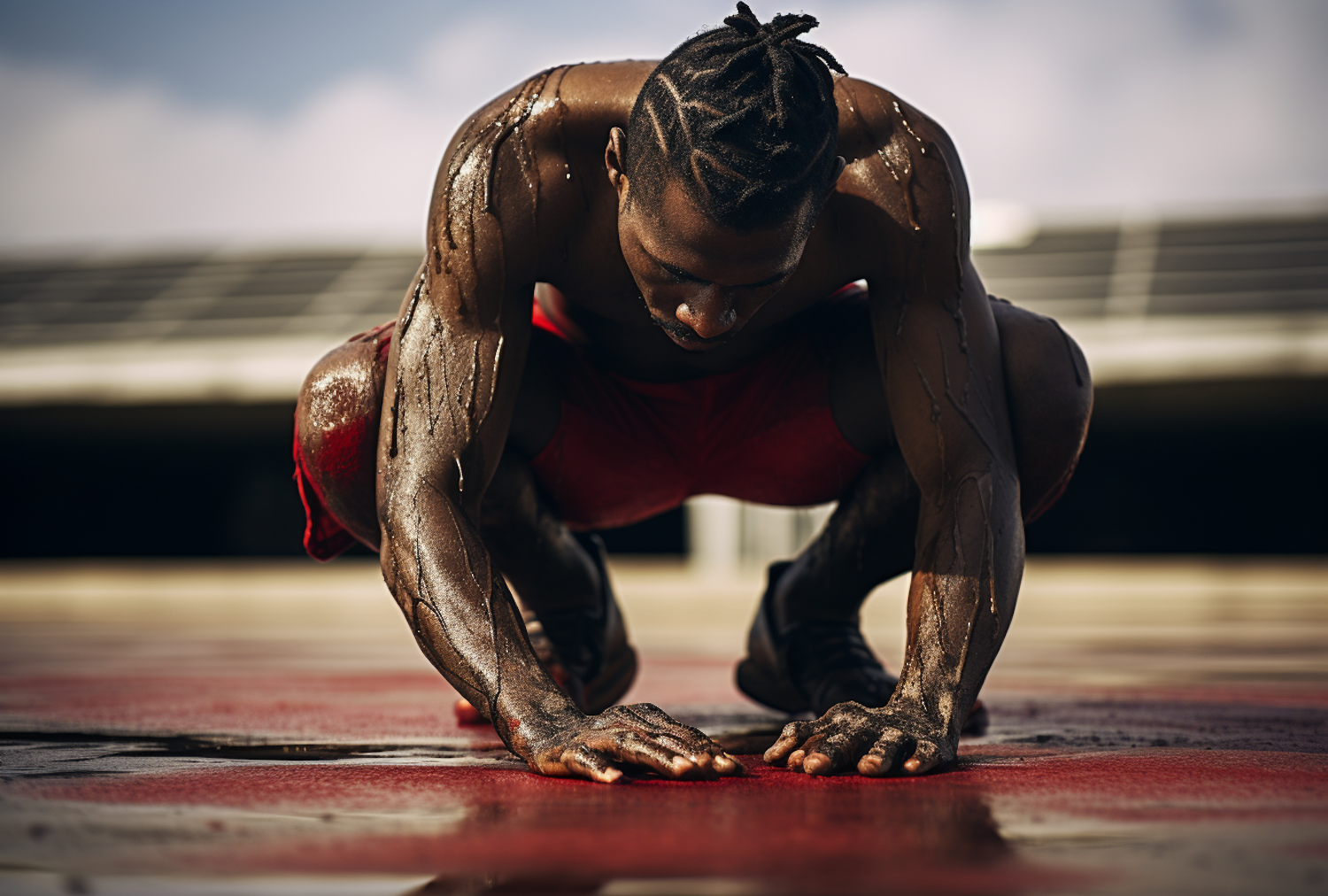 Muscular athlete in red shorts crouches on a wet track, ready to sprint. His focused expression and glistening skin highlight his determination.