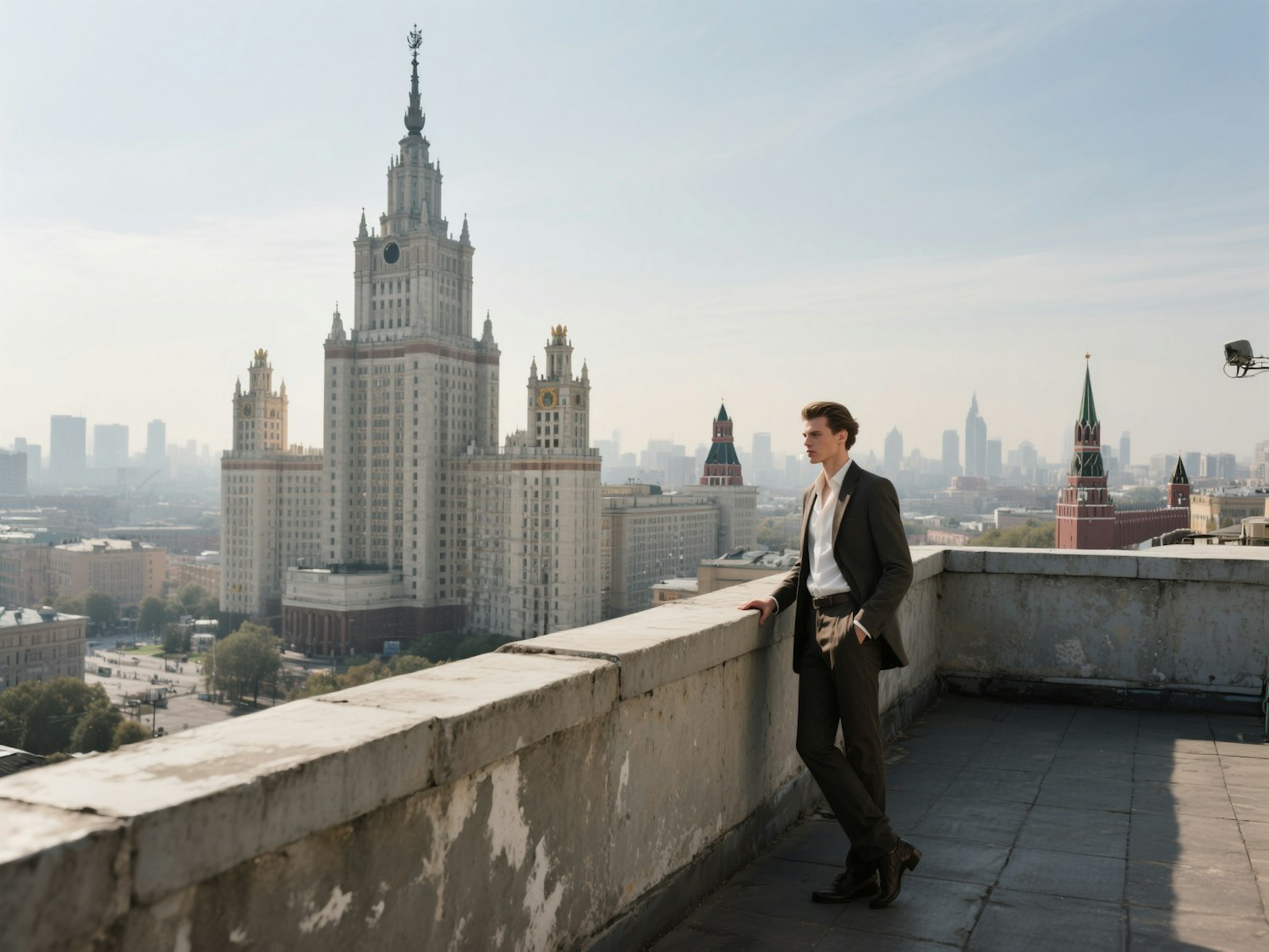 A cinematic and atmospheric urban photoshoot on a rooftop or open terrace in Moscow, with a monumental Stalinist-style skyscraper (one of the Seven Sisters, possibly the Ukraina Hotel) dominating the background. The cityscape includes recognizable Moscow architectural landmarks and distant city buildings, creating a sense of depth and scale. In the foreground, a concrete parapet with scuff marks. Shot with a 35mm or 50mm fast lens (like 50mm f/1.8 or 35mm f/1.4), natural spatial depth, soft background blur, smooth tonal transitions, detailed model and background, no distortion, soft daylight, editorial style