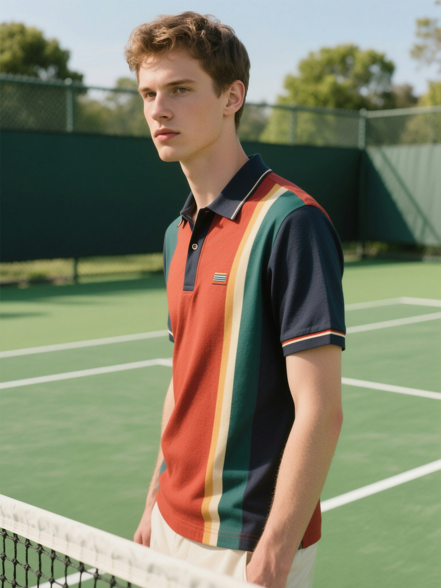 Stylish young man in a colorful striped polo shirt on a sunny tennis court, blending sporty and casual vibes.
