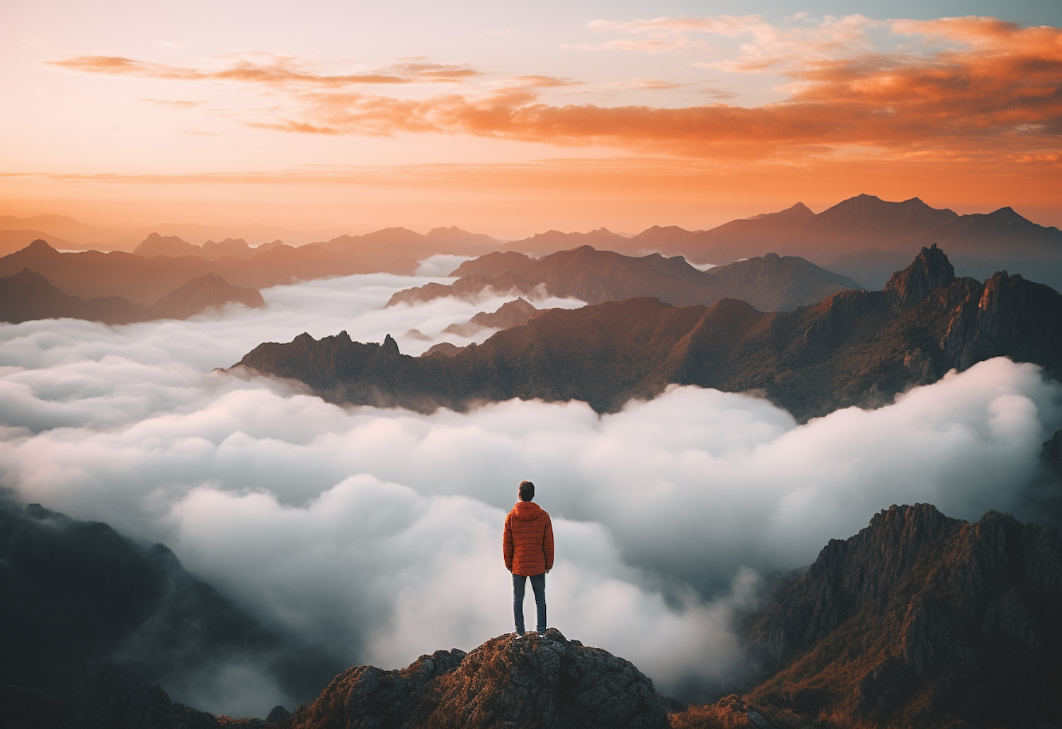 Person in orange jacket stands on mountain peak, overlooking a sea of clouds and distant mountains at sunrise or sunset.
