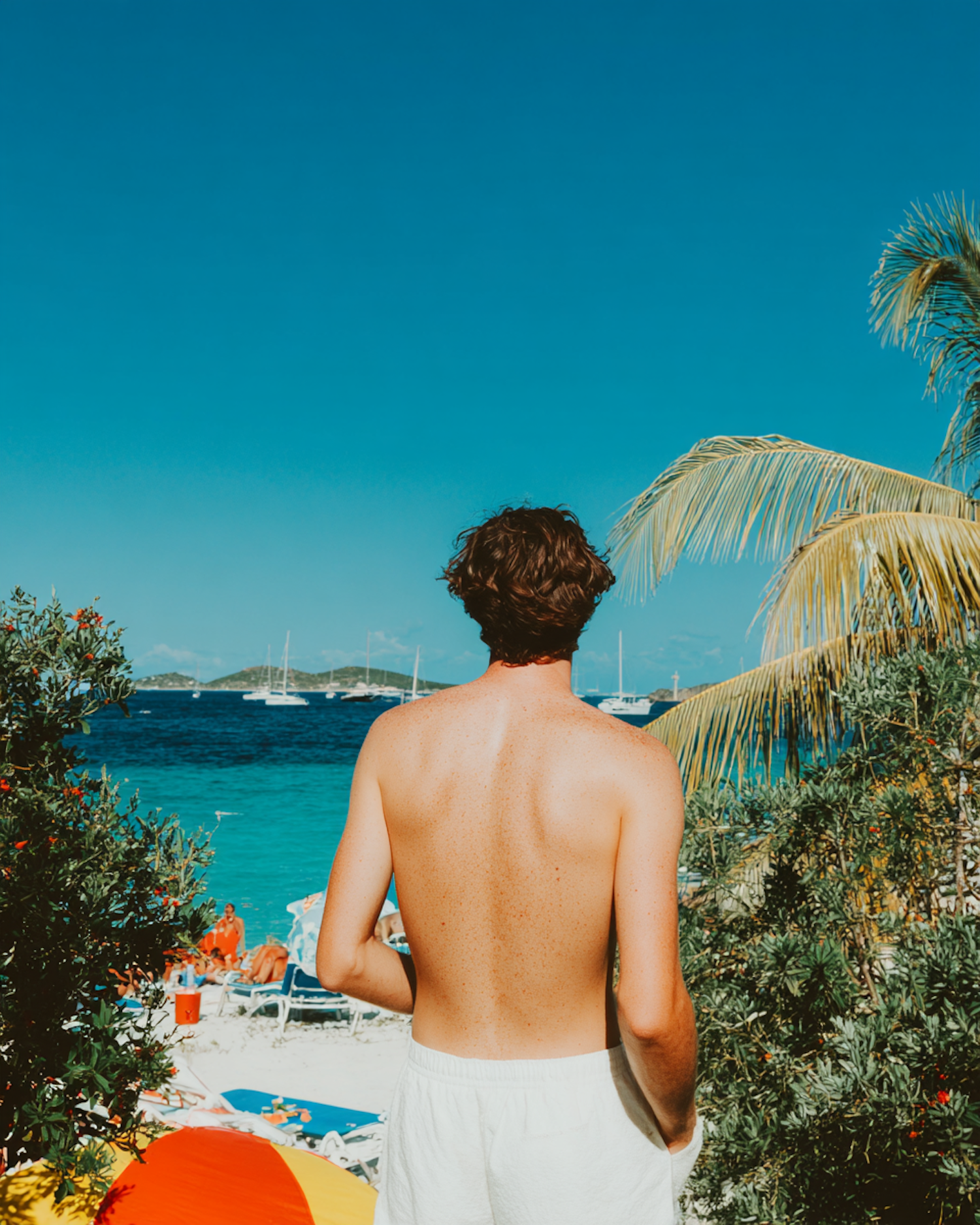 Man in white shorts enjoying a tropical beach view with clear blue skies, palm trees, and boats on the ocean.