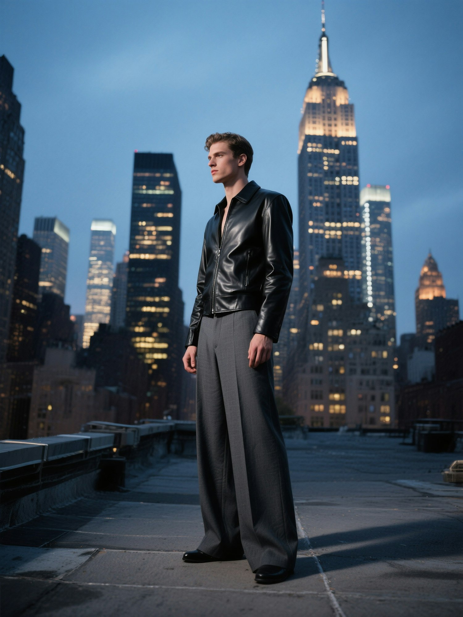 1. High-rise rooftop in New York at dusk — one male model in a fitted leather jacket and wide-leg trousers stands motionless, framed against the skyline. Shot like Steven Meisel for Vogue Italia: cinematic light, heavy shadows, editorial presence in stillness.