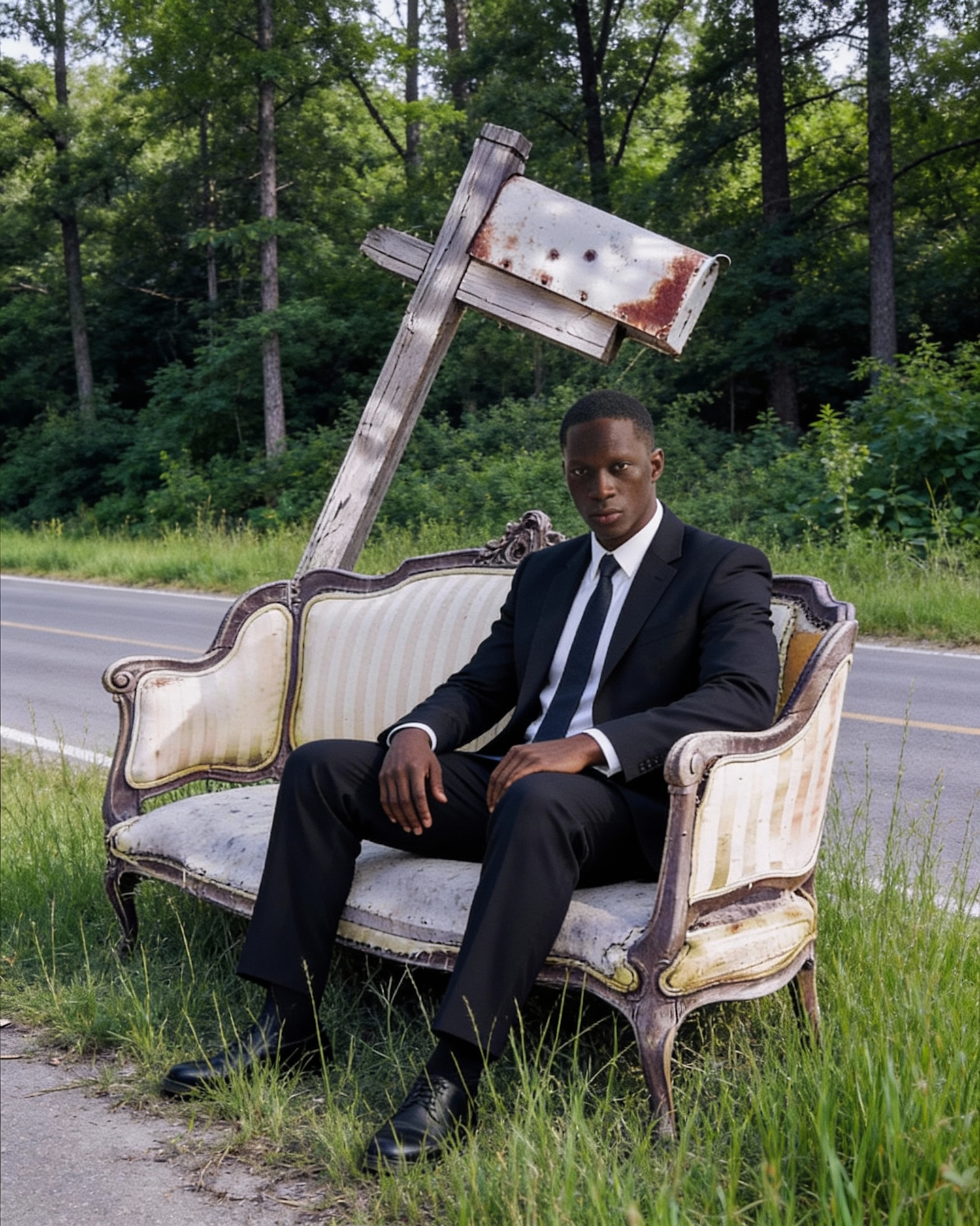 A man in a black suit sits on a vintage sofa by a roadside, with a leaning mailbox and a forested background creating a unique scene.