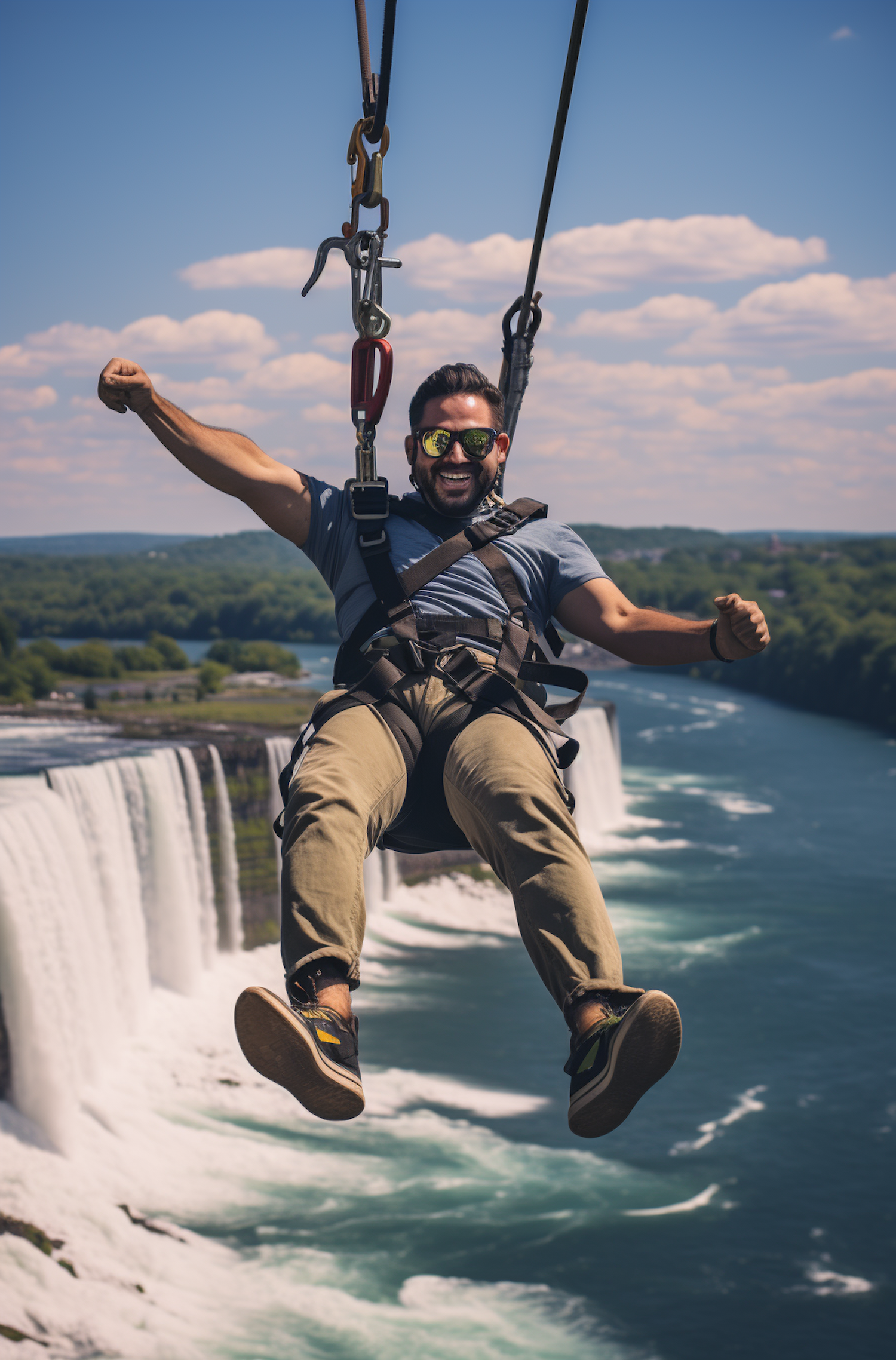 Man zip-lining over a waterfall, smiling with excitement. Clear blue sky and cascading water create a thrilling adventure scene.