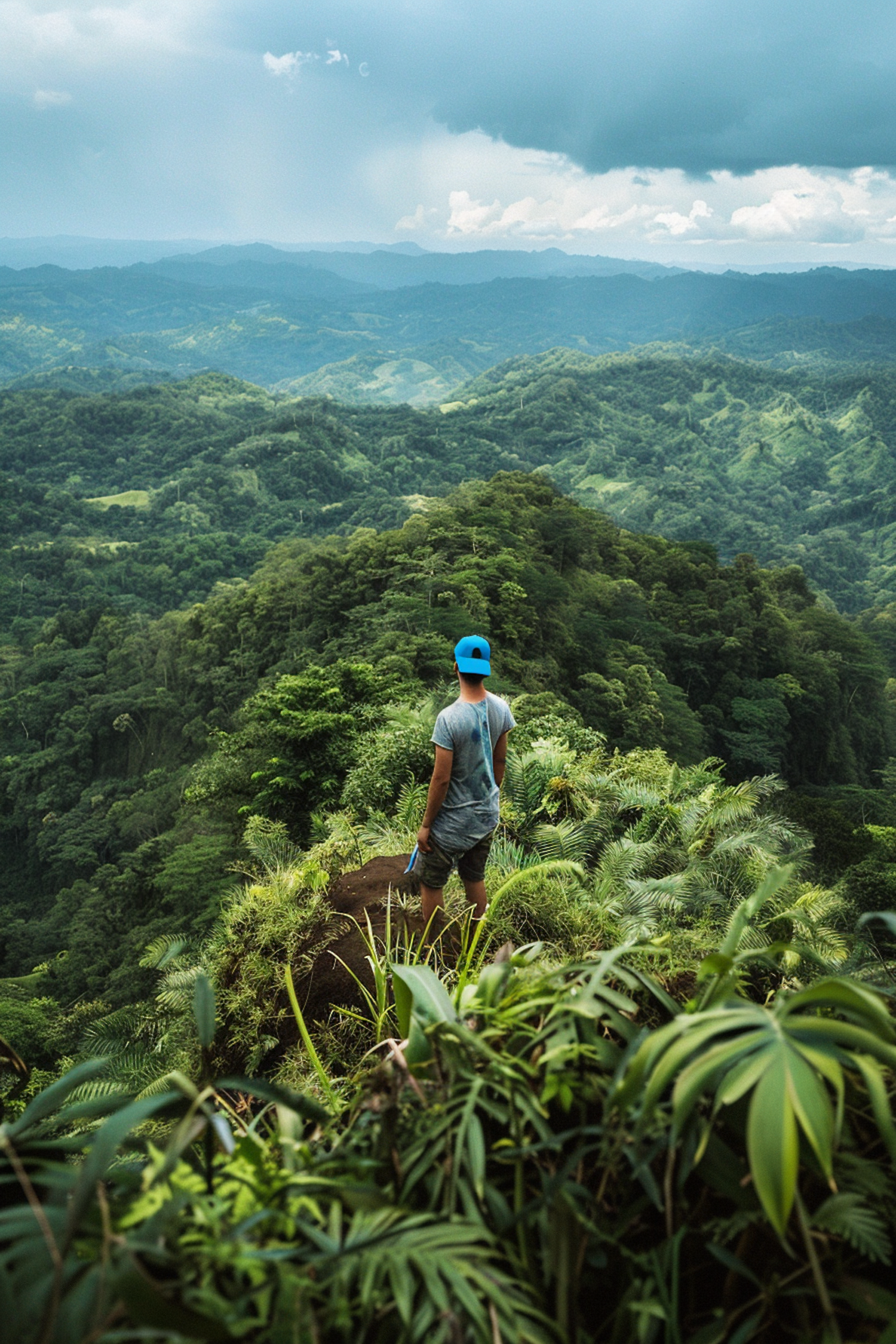 Person in blue cap stands on lush hilltop, overlooking vast green forest under an overcast sky. Dramatic and serene landscape view.