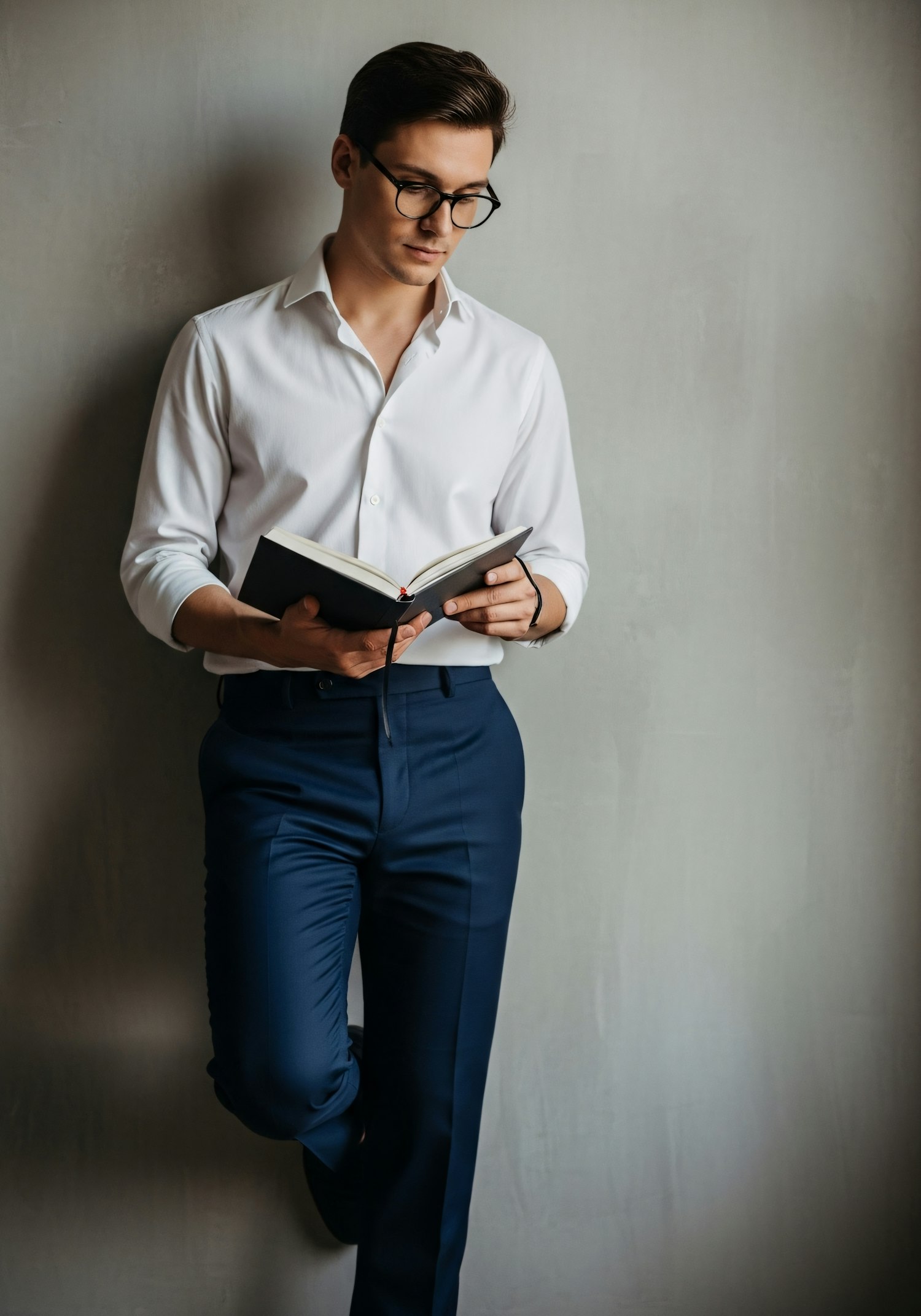 A man in a white shirt and blue trousers leans against a wall, reading a book with a thoughtful expression.