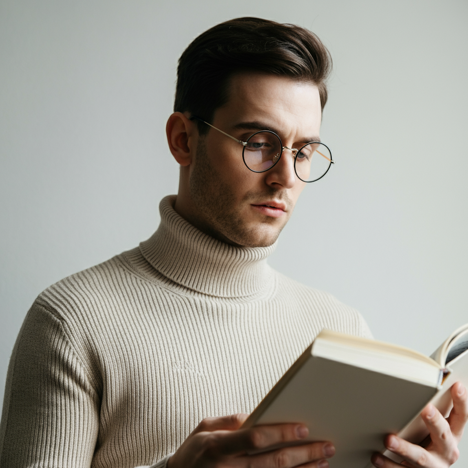 A man in a beige turtleneck and round glasses reads a book with a focused expression, set against a minimal, softly lit background.