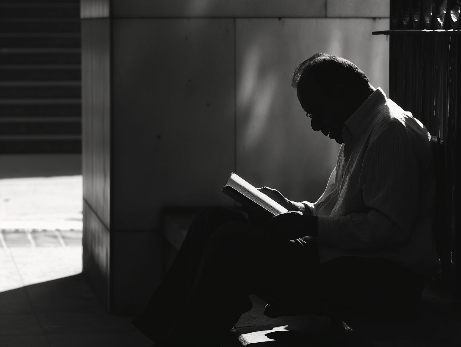 Silhouette of a man reading a book on a bench, captured in black and white, highlighting light and shadow contrast.