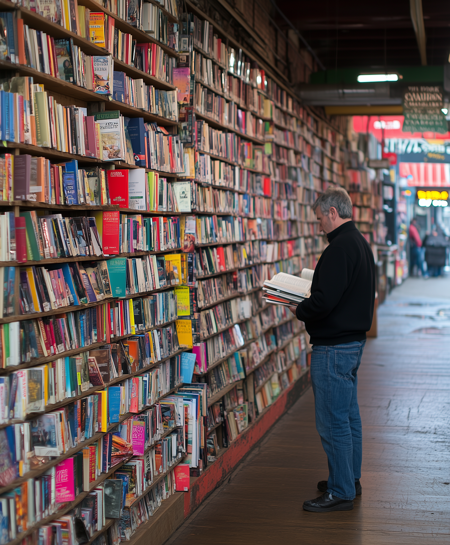 Caucasian man reading in a cozy bookstore aisle, surrounded by colorful bookshelves. Engrossed in a book, wearing a black sweater and jeans.
