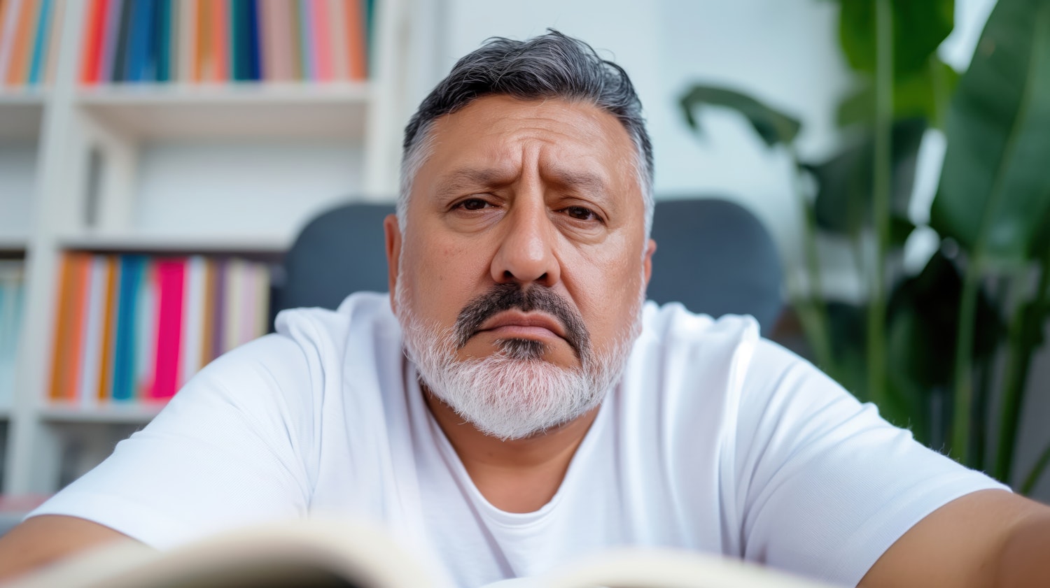 Serious middle-aged man with gray hair and beard reading a book, colorful bookshelves and a plant in the background.