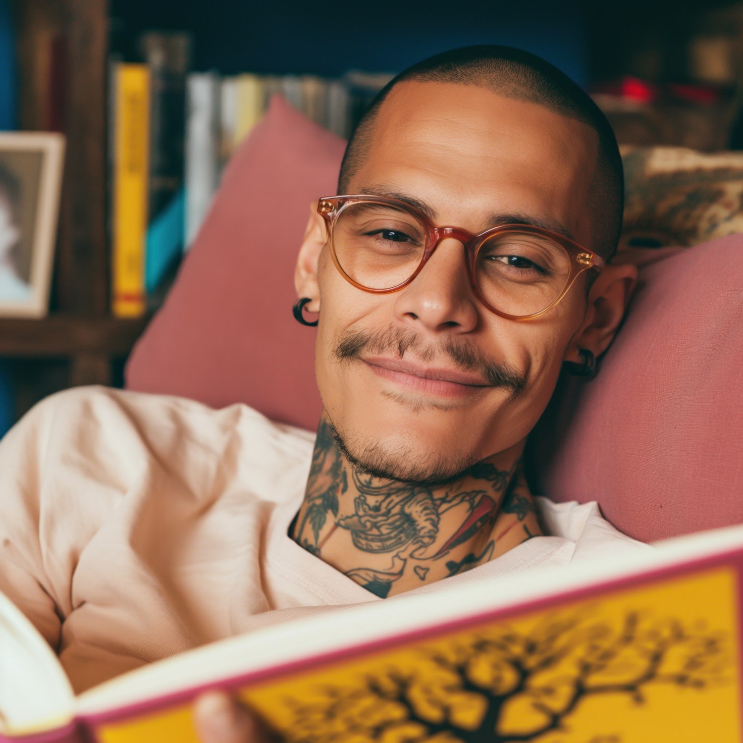 Young man with glasses and tattoos reading a book on a cozy couch, surrounded by bookshelves and warm decor.