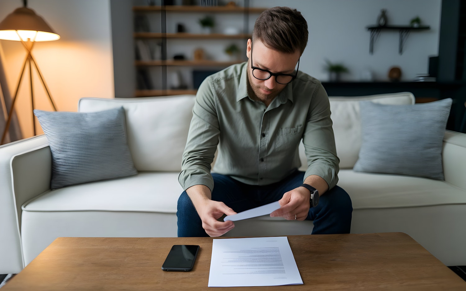 Man with glasses reading a document on a couch, with a smartphone and paper on a wooden table in a modern living room.