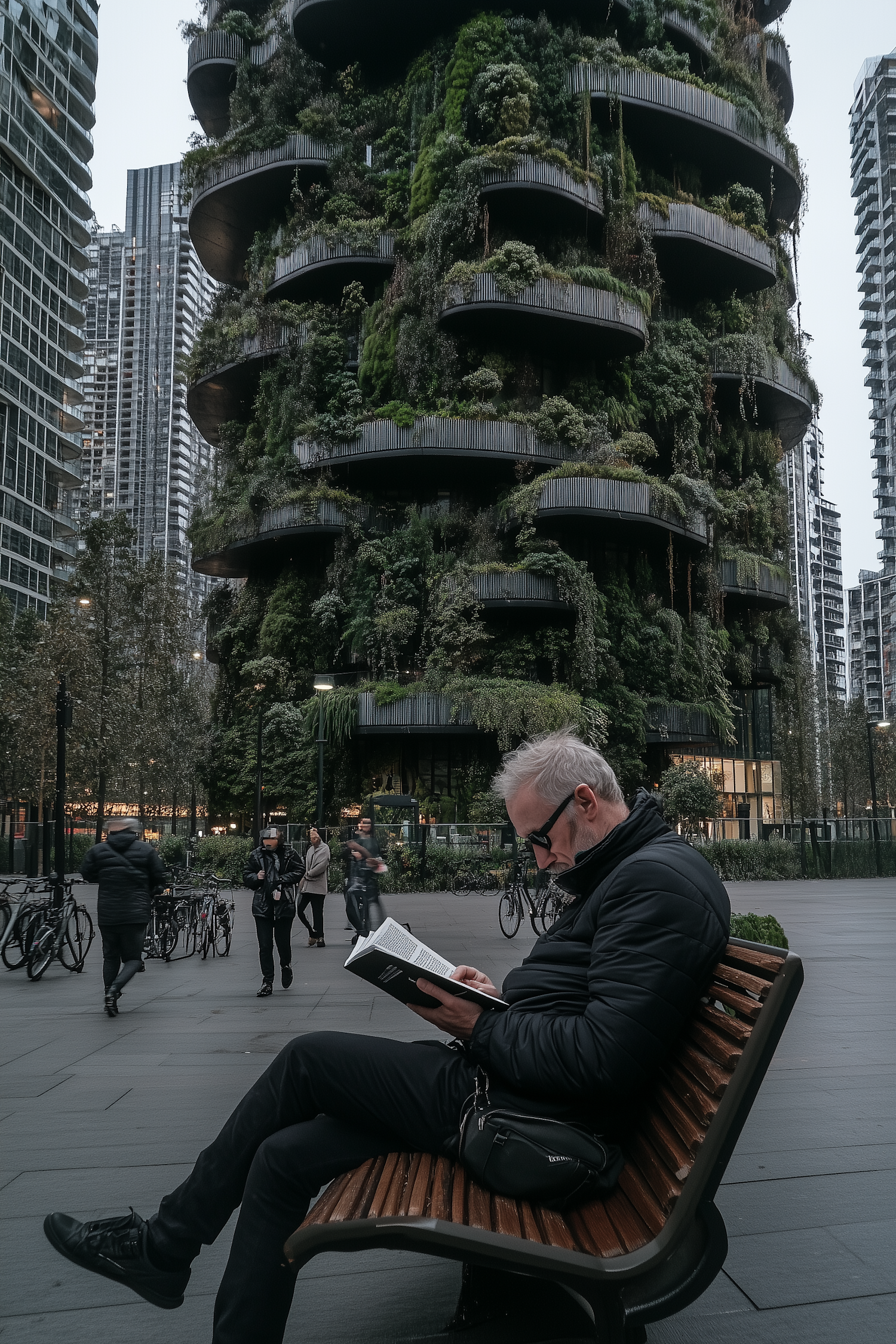 Man reading on a bench in front of a lush vertical garden building, surrounded by modern skyscrapers and city life.