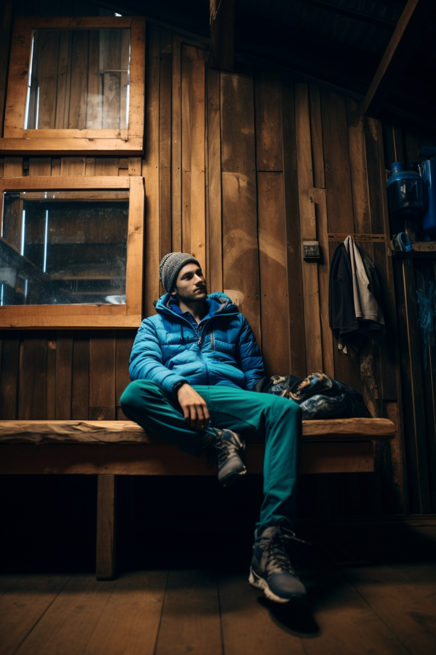Man in blue jacket and beanie relaxes on a wooden bench in a rustic cabin, surrounded by wooden walls and hanging gear.