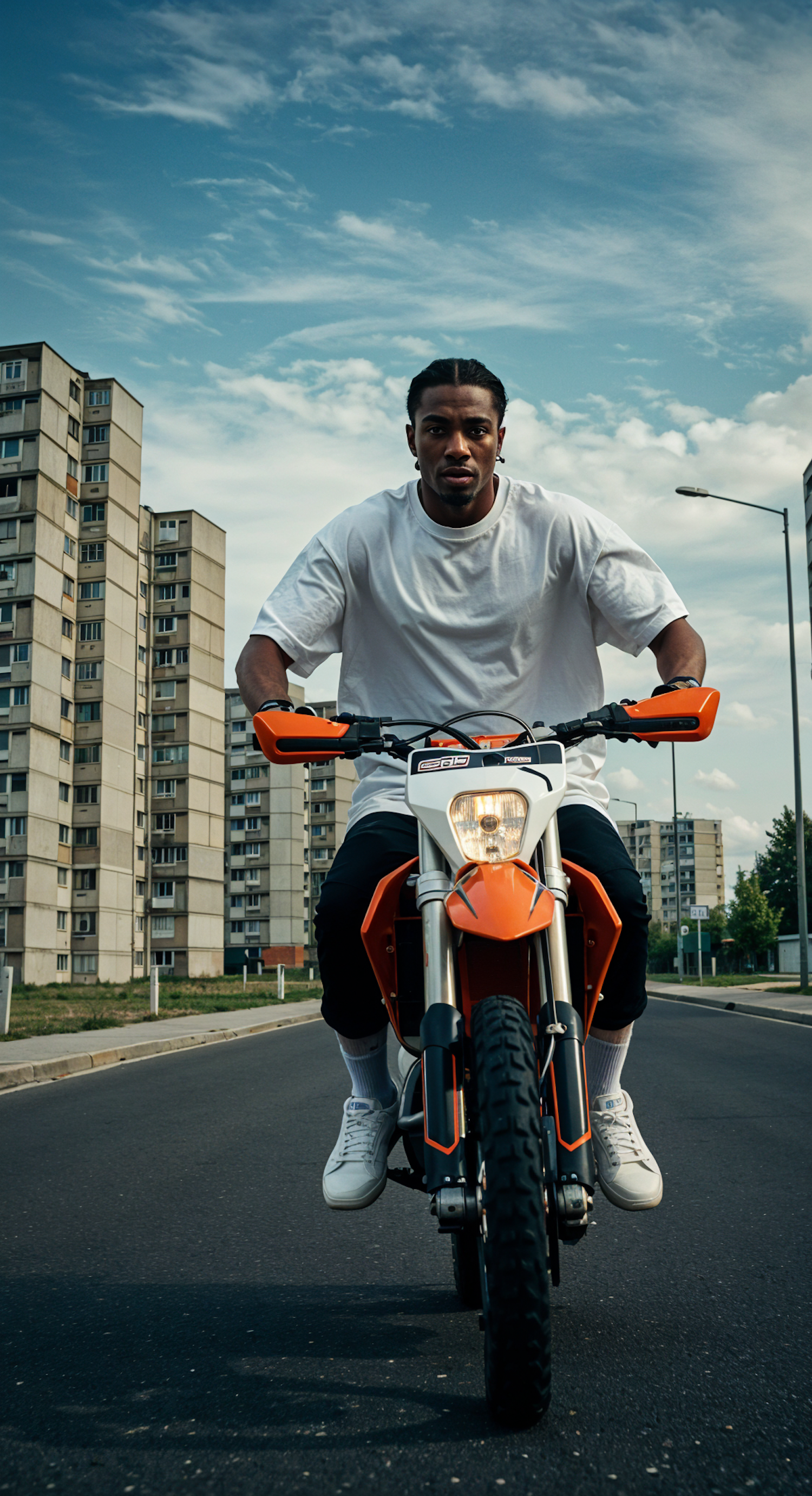 Young man confidently rides an orange motorcycle in an urban setting with tall buildings and a blue sky.