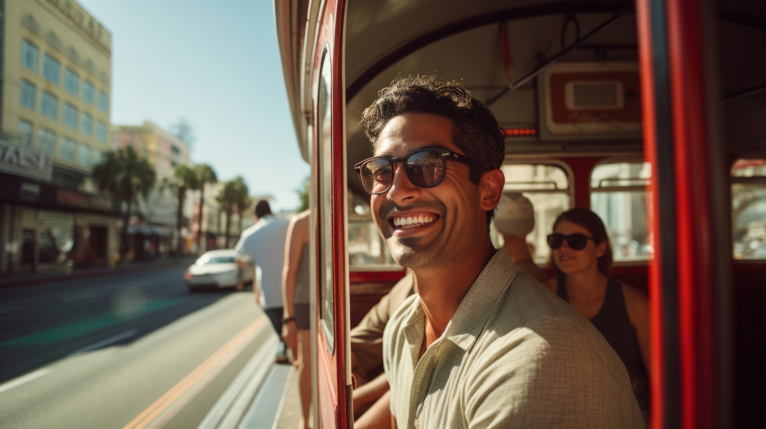 Man smiling on a red tram ride through a sunny city street, enjoying the day with fellow passengers.