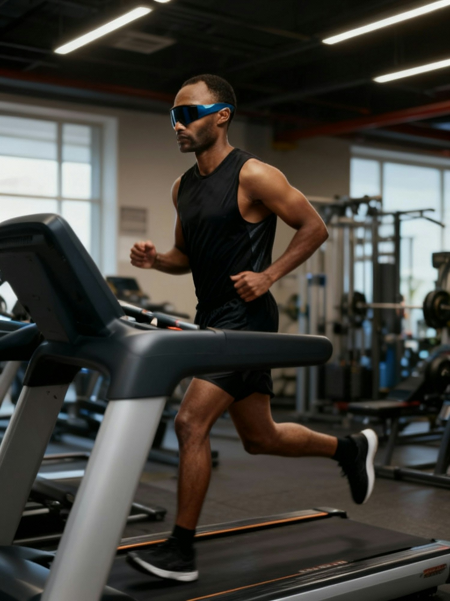 A man running on a treadmill in a gym, wearing black athletic gear and blue-tinted sports glasses, with gym equipment in the background.