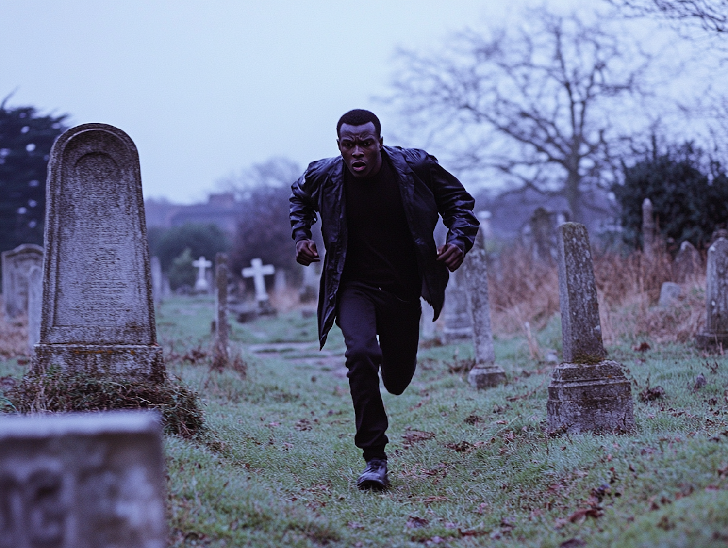 A man in a black leather jacket runs through a graveyard, surrounded by old tombstones and an overcast sky, creating a tense atmosphere.