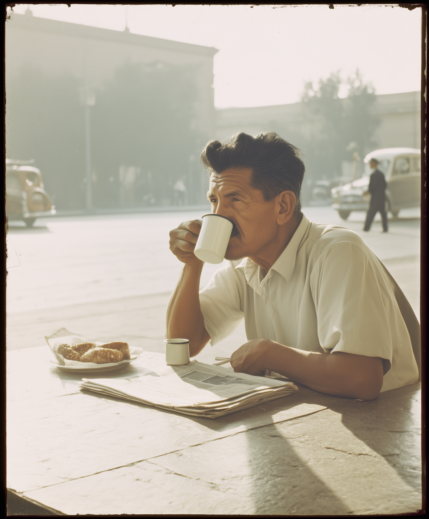Man enjoying coffee and pastries at an outdoor table, with a vintage urban backdrop and warm sunlight creating a nostalgic vibe.