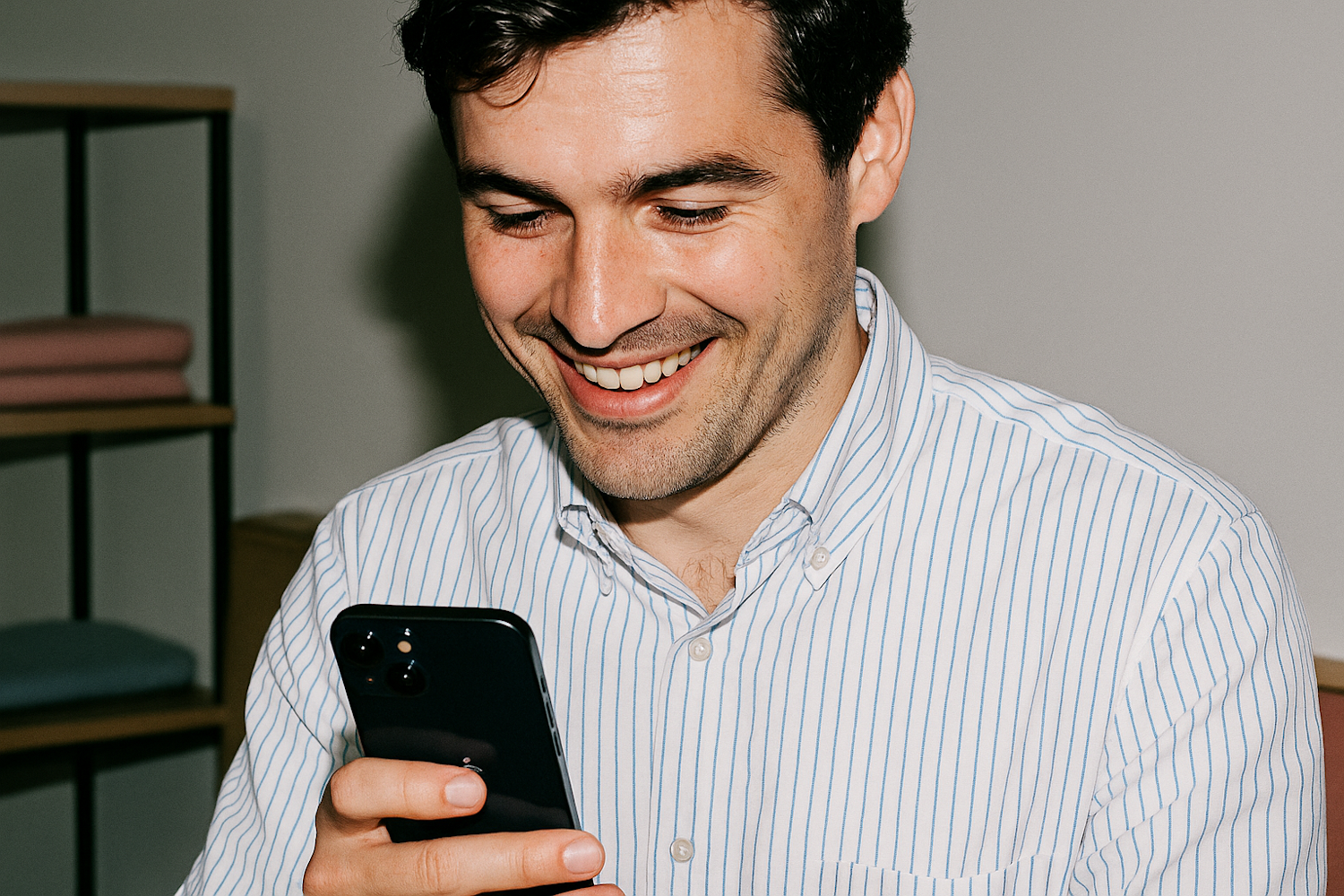 Man smiling while looking at his smartphone, wearing a striped shirt in a cozy indoor setting with shelves in the background.