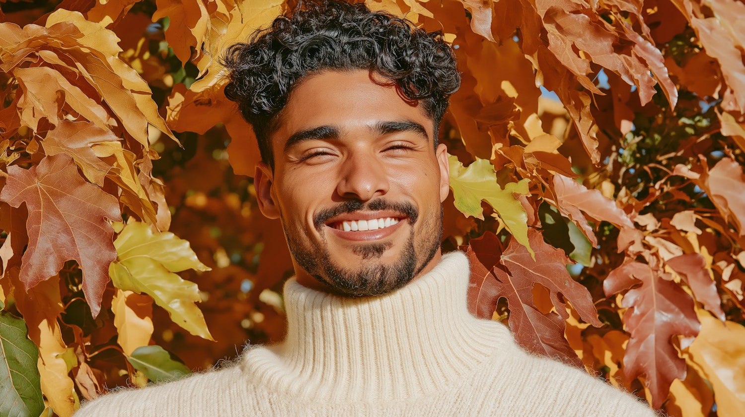 Smiling man in a cream turtleneck amidst vibrant autumn leaves, exuding warmth and joy in a sunlit fall setting.