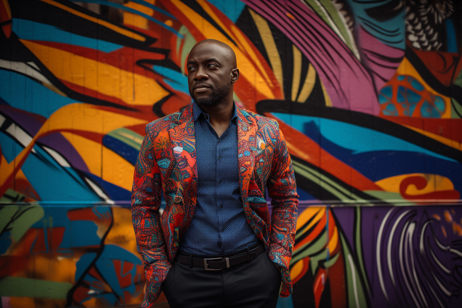 Stylish man in a colorful jacket stands against a vibrant graffiti wall, exuding confidence and urban flair.