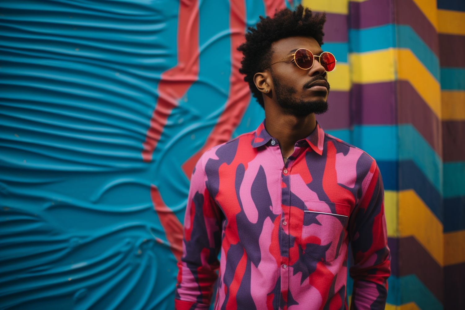Stylish man in vibrant shirt and sunglasses stands against a colorful mural, showcasing bold fashion and artistic flair.