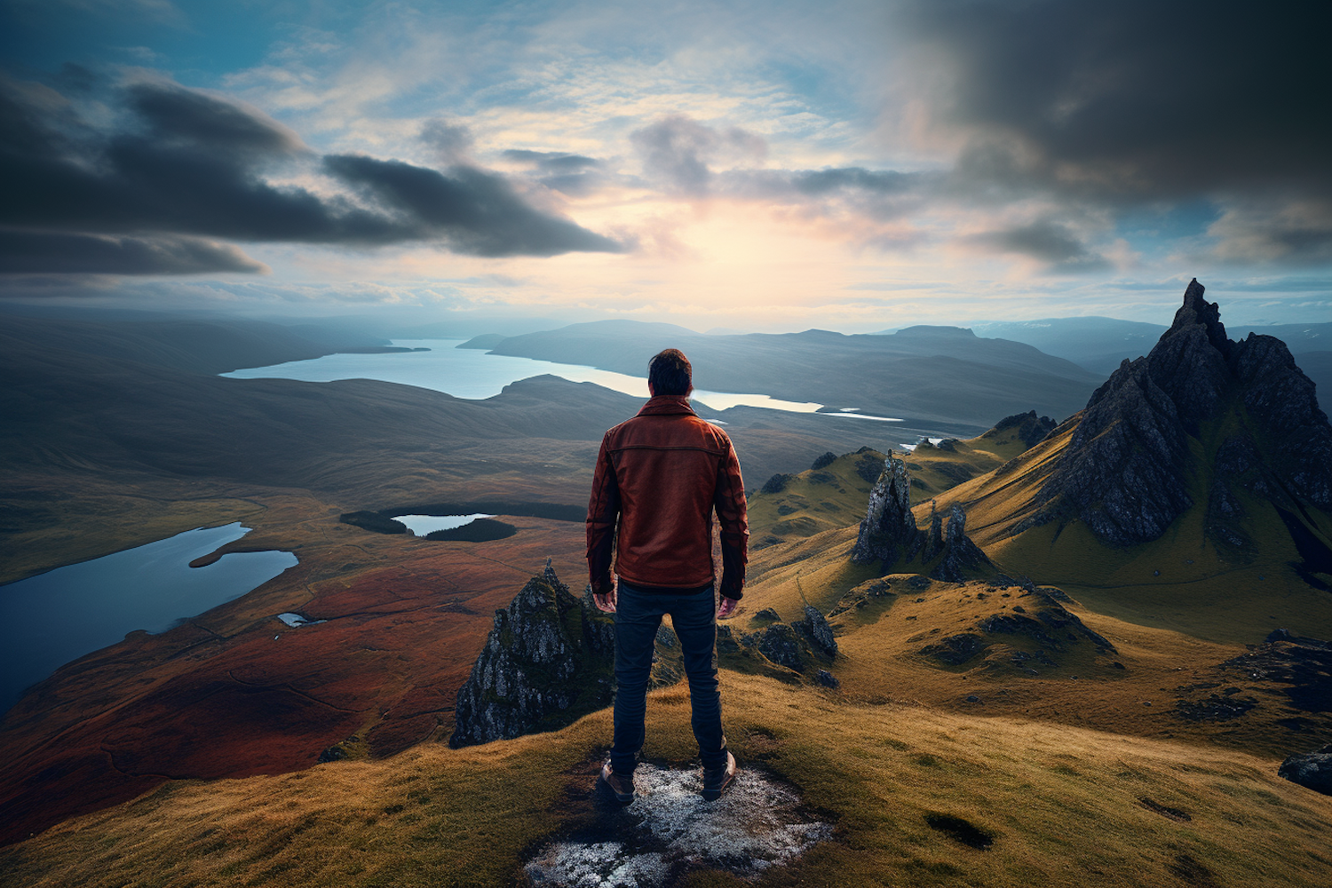 Man in brown jacket stands on hilltop, overlooking stunning landscape with lakes and dramatic sky. A moment of reflection and awe.