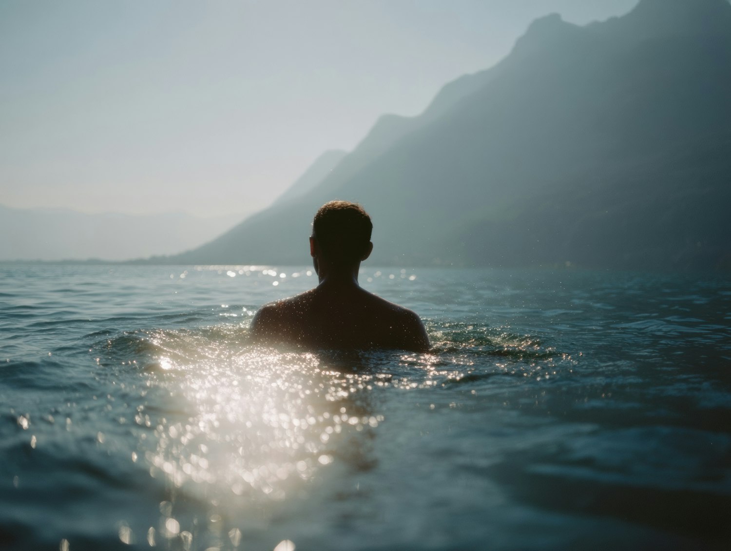 A man swims in tranquil waters with a hazy mountain backdrop, sunlight sparkling on the surface, creating a serene and peaceful vibe.