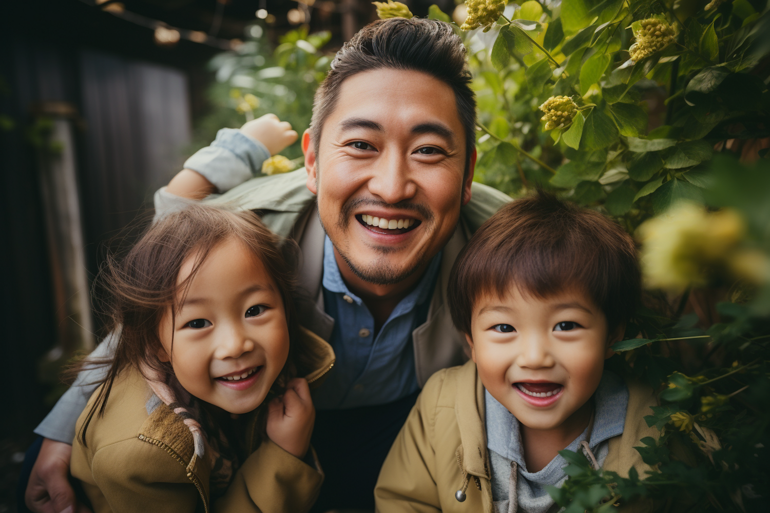 Family portrait in lush greenery with blurred faces, showcasing a parent and two children in beige jackets amidst yellow flowers.