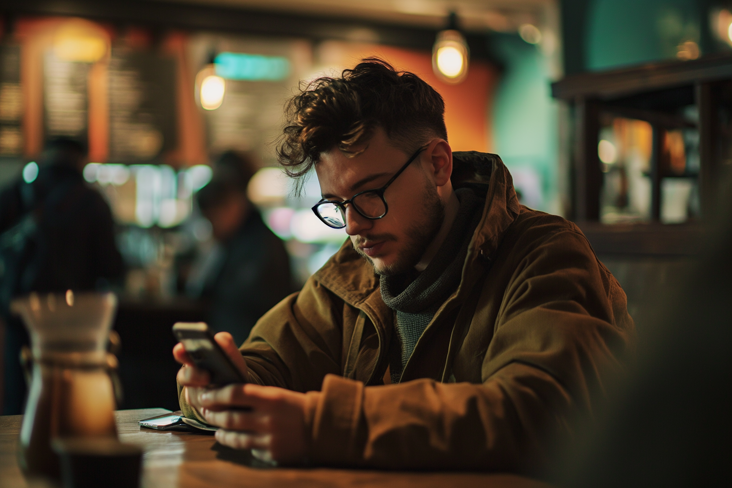 Young man with glasses using smartphone in a cozy cafe, warm lighting, casual attire, focused expression.