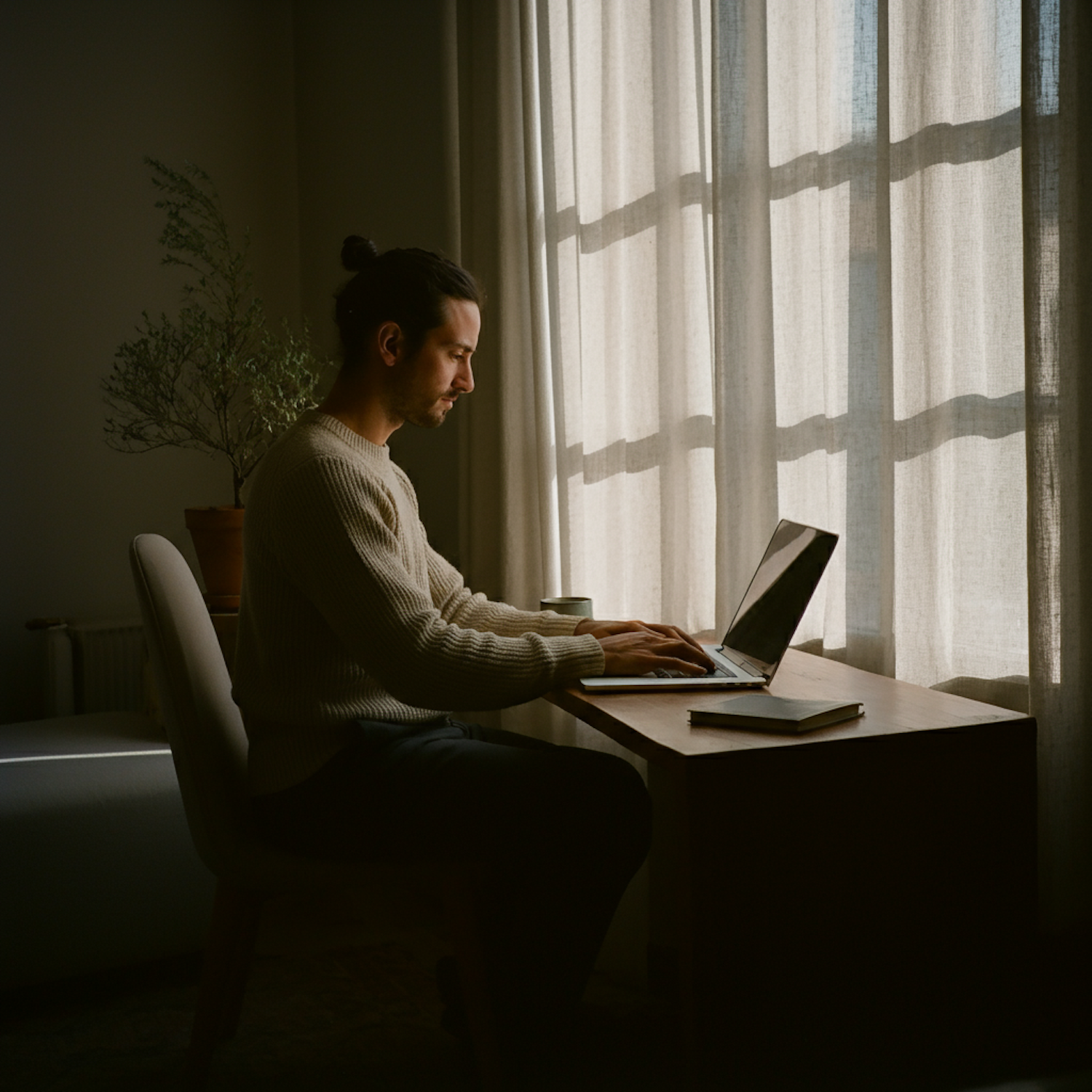 Man with a bun working on a laptop at a wooden desk, surrounded by natural light and minimalist decor.
