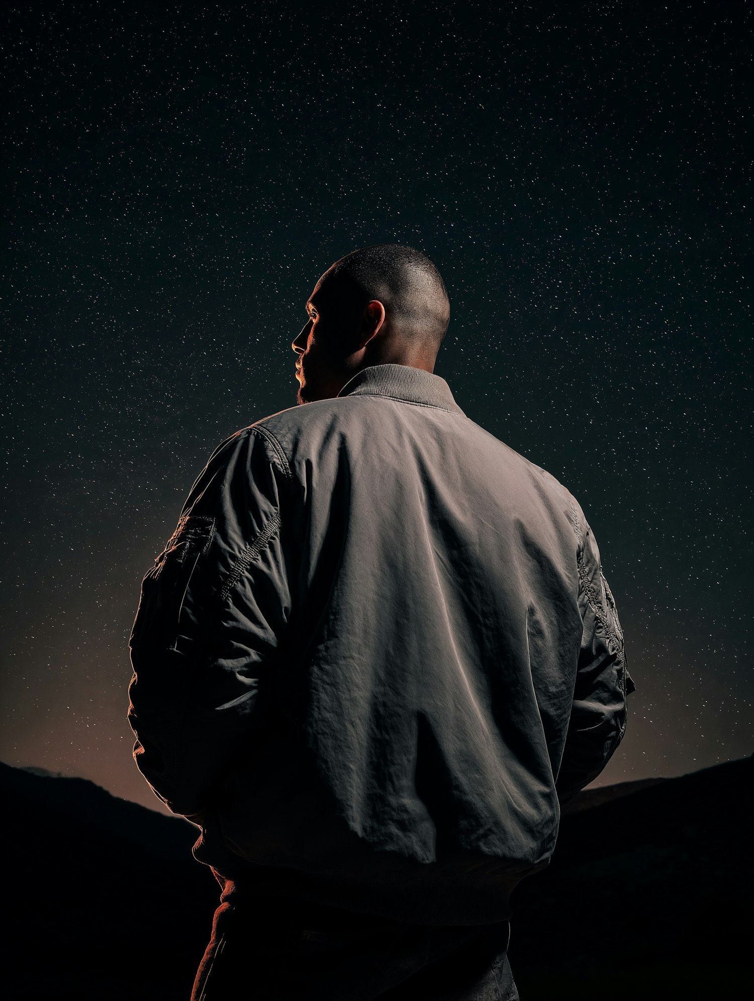 A man in a gray bomber jacket gazes at a starry night sky, creating a serene and contemplative scene.