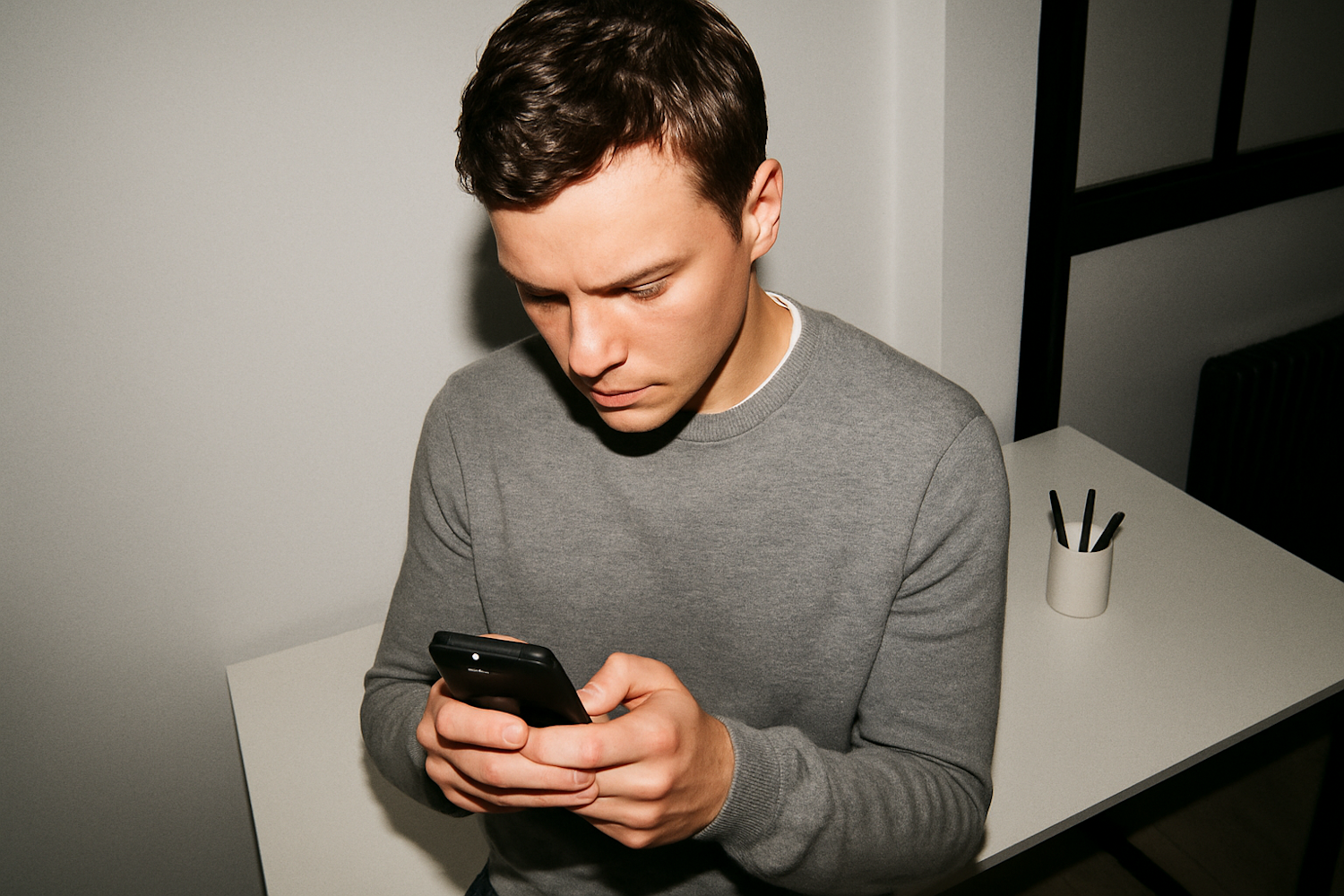 Man in a gray sweater intently using a smartphone, seated at a modern desk with a minimalistic background.