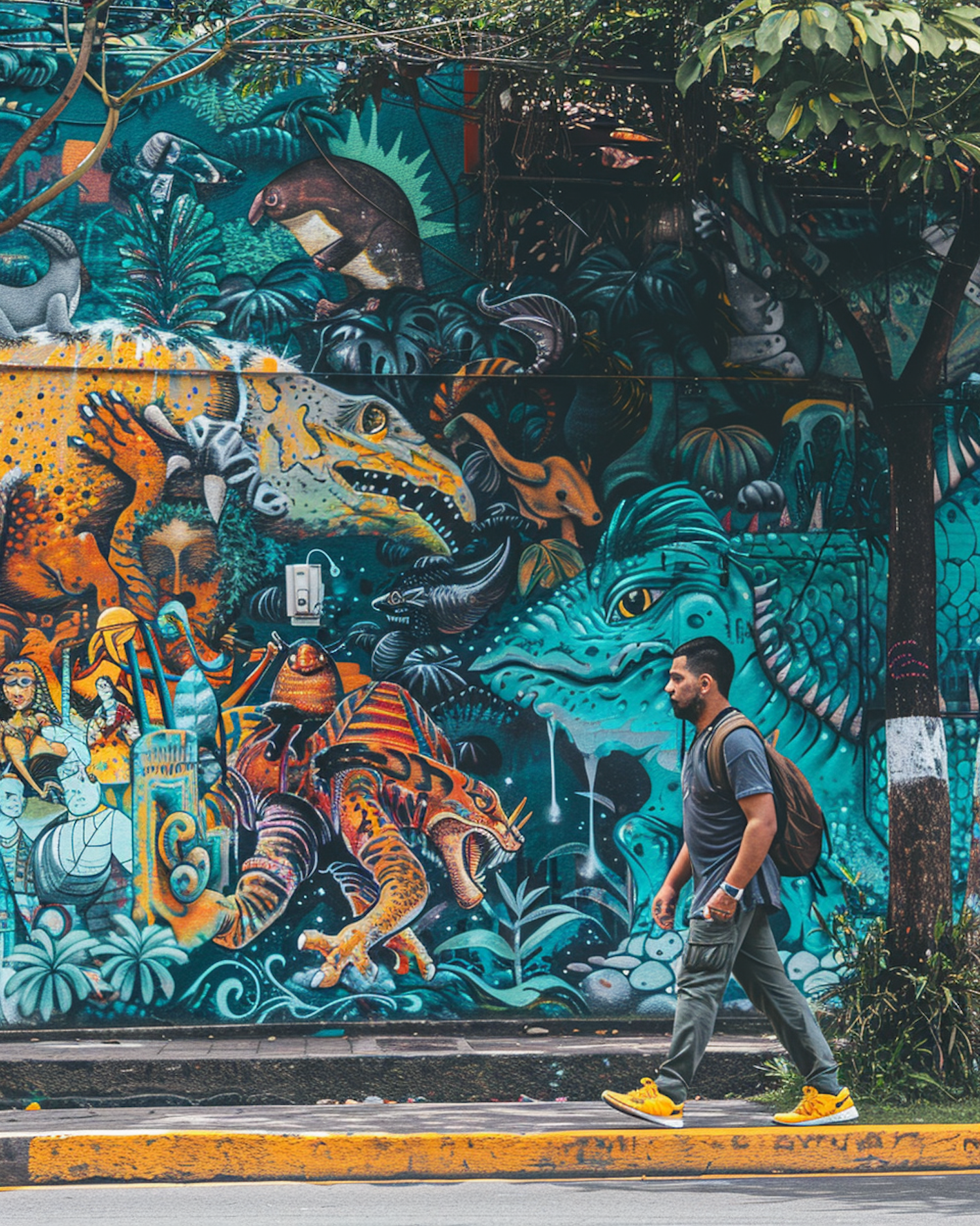 Man walks past a vibrant mural with fantastical creatures, wearing yellow sneakers and a backpack. Urban art meets everyday life.