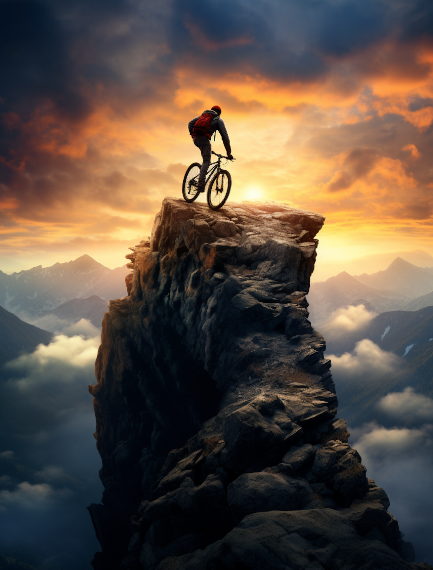 Cyclist on a mountain peak at sunset, silhouetted against vibrant skies, showcasing adventure and triumph.