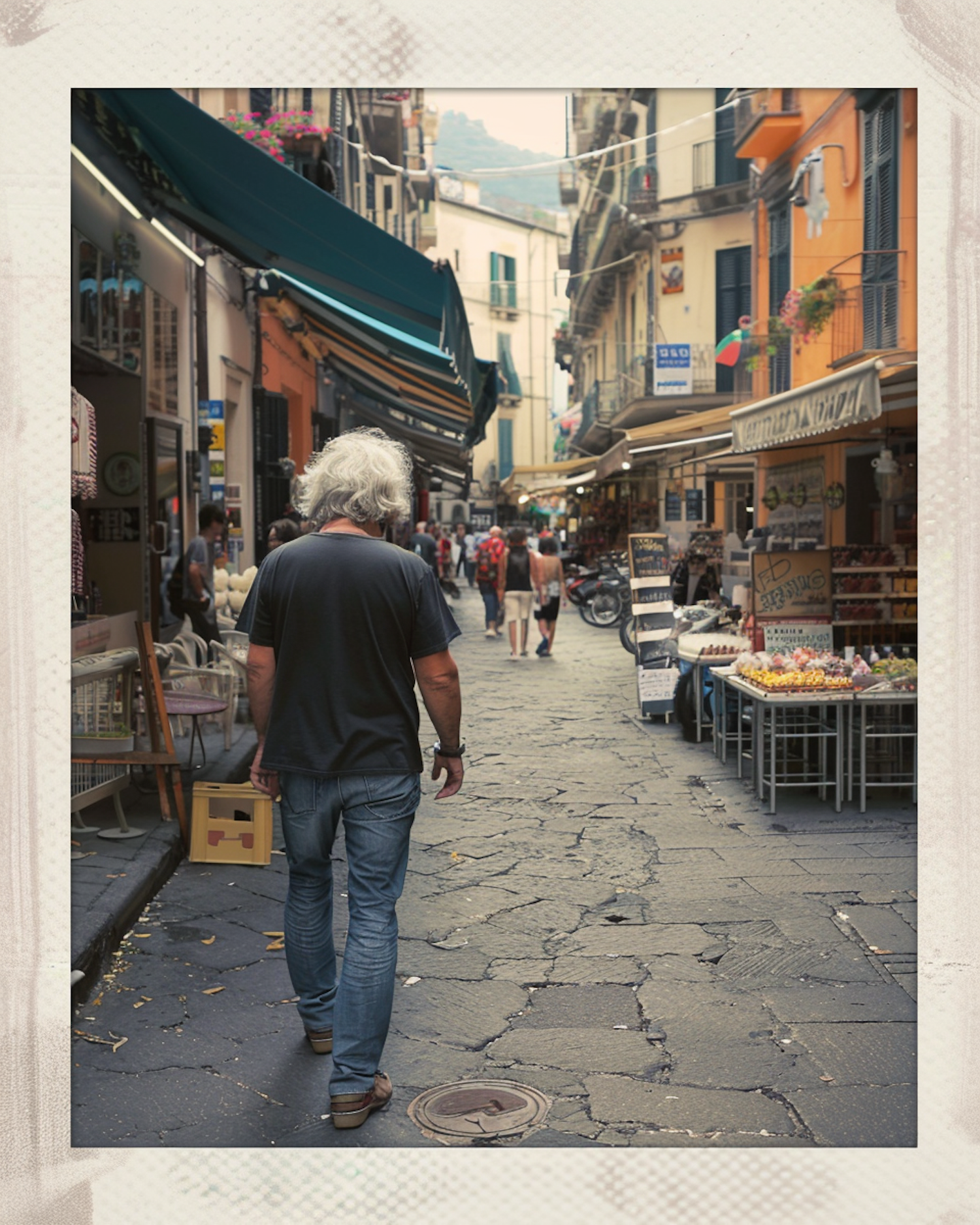 Cobbled street in a European town with colorful buildings, shops, and a bustling crowd. A man walks away holding a box.