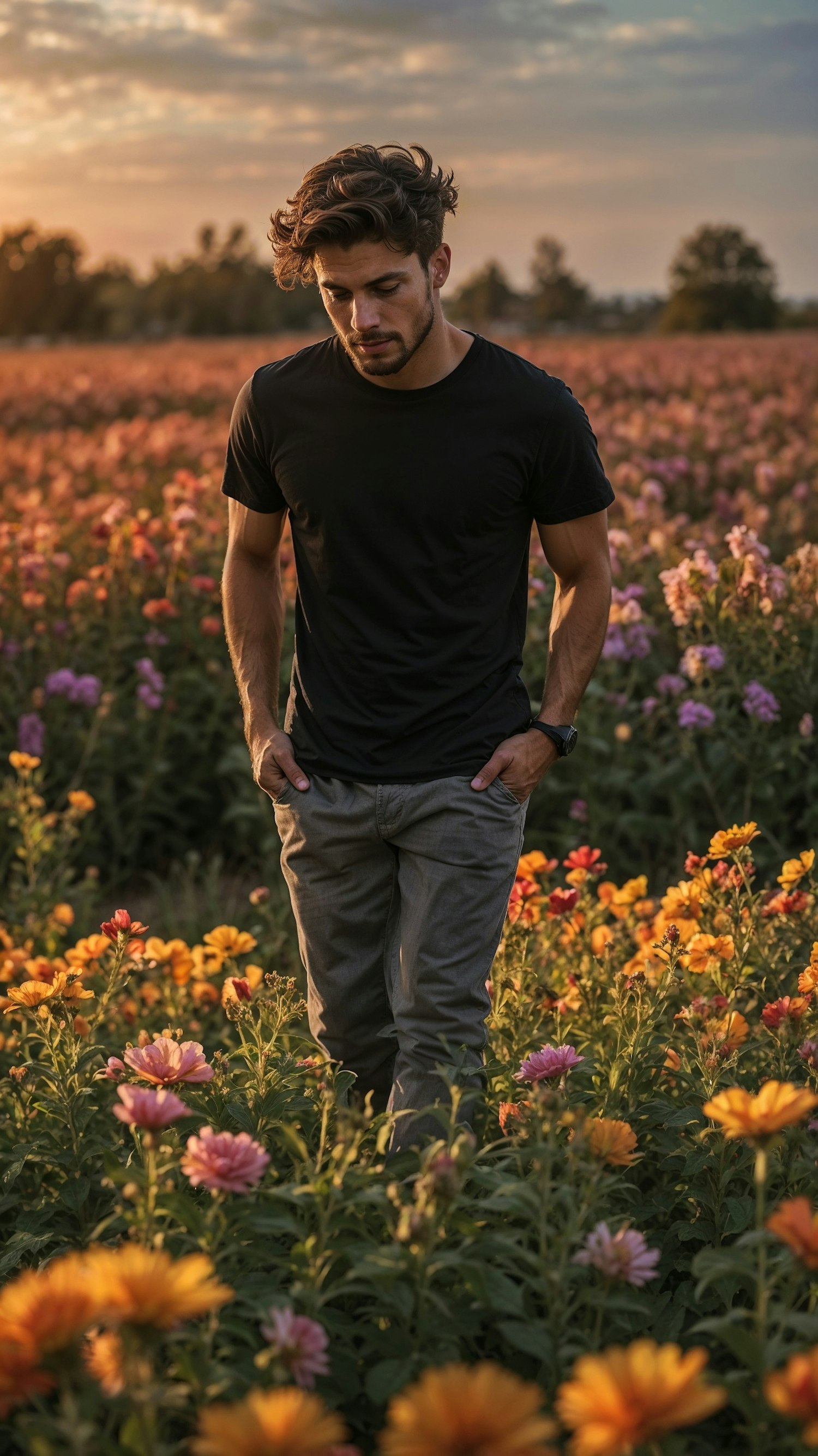 Young man in a flower field at sunset, wearing a black t-shirt and gray pants, surrounded by vibrant blooms and a golden sky.