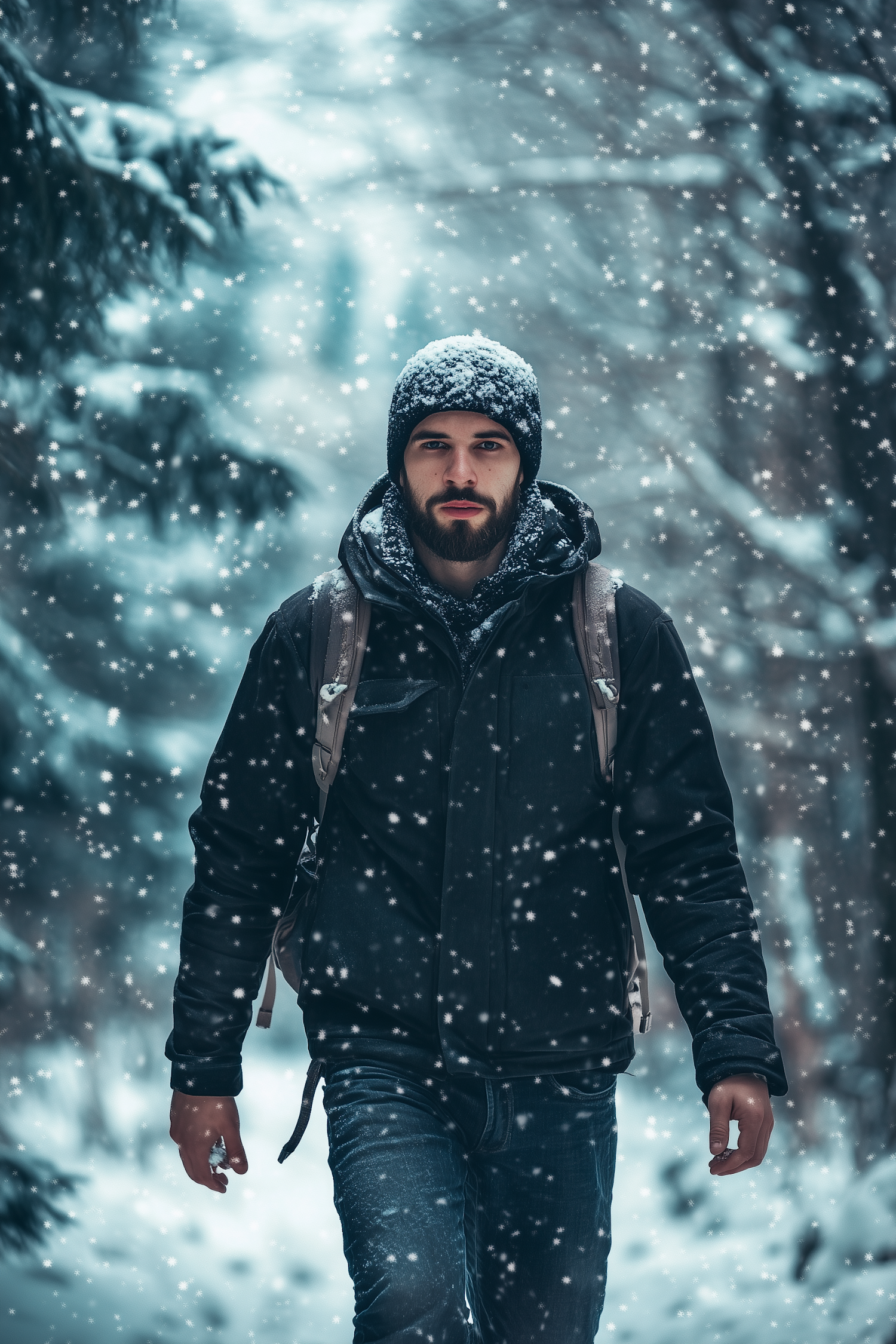 Man in winter attire walking through a snowy forest, surrounded by falling snowflakes, creating a serene and wintry atmosphere.