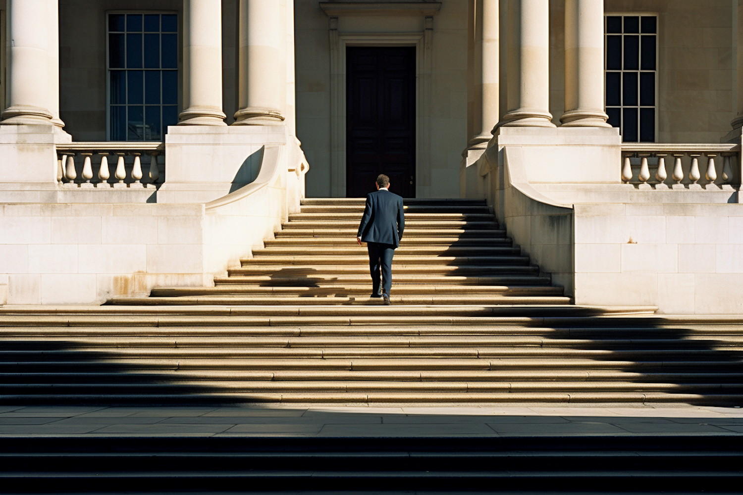 Man in a suit climbs grand stone steps of a classical building, bathed in sunlight, creating dramatic shadows and a sense of purpose.