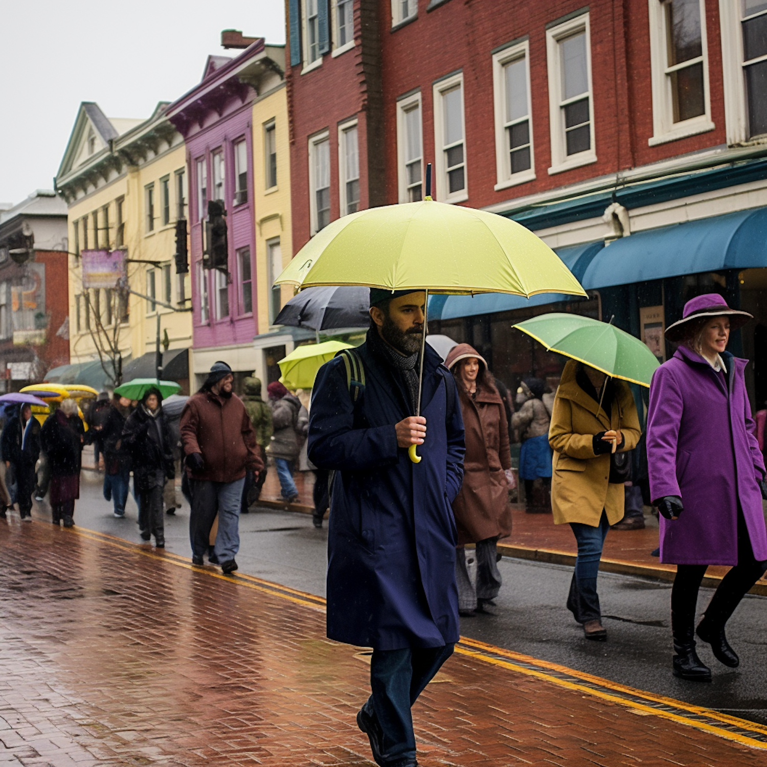 People walking with colorful umbrellas on a rainy day in a charming town with vibrant buildings and a wet brick street.