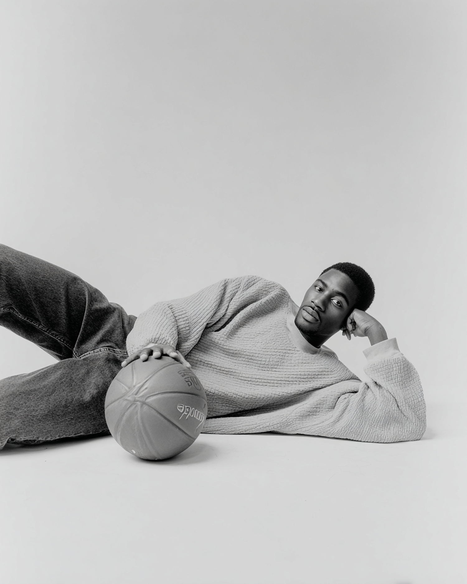 Stylish monochrome portrait of a man lying relaxed with a basketball, wearing a casual sweater and jeans, exuding a laid-back vibe.