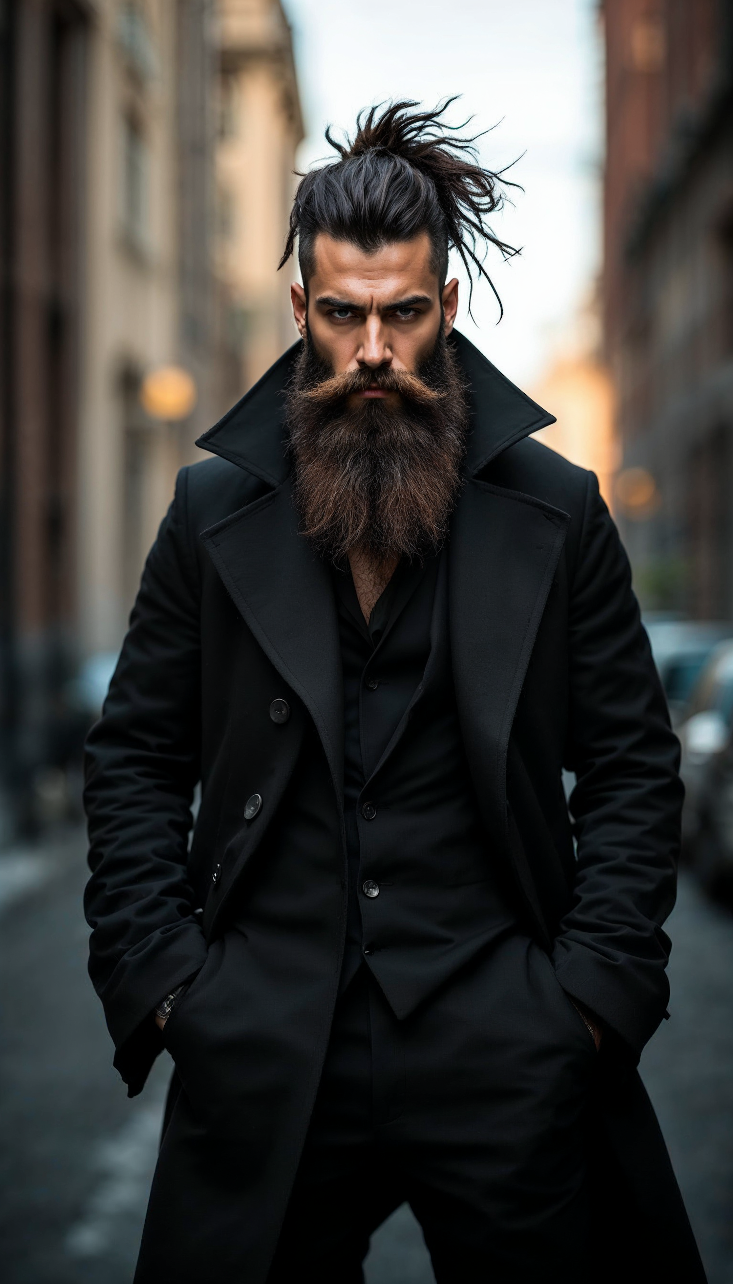 Bearded man with intense gaze in urban setting, wearing a stylish black coat and messy bun hairstyle.