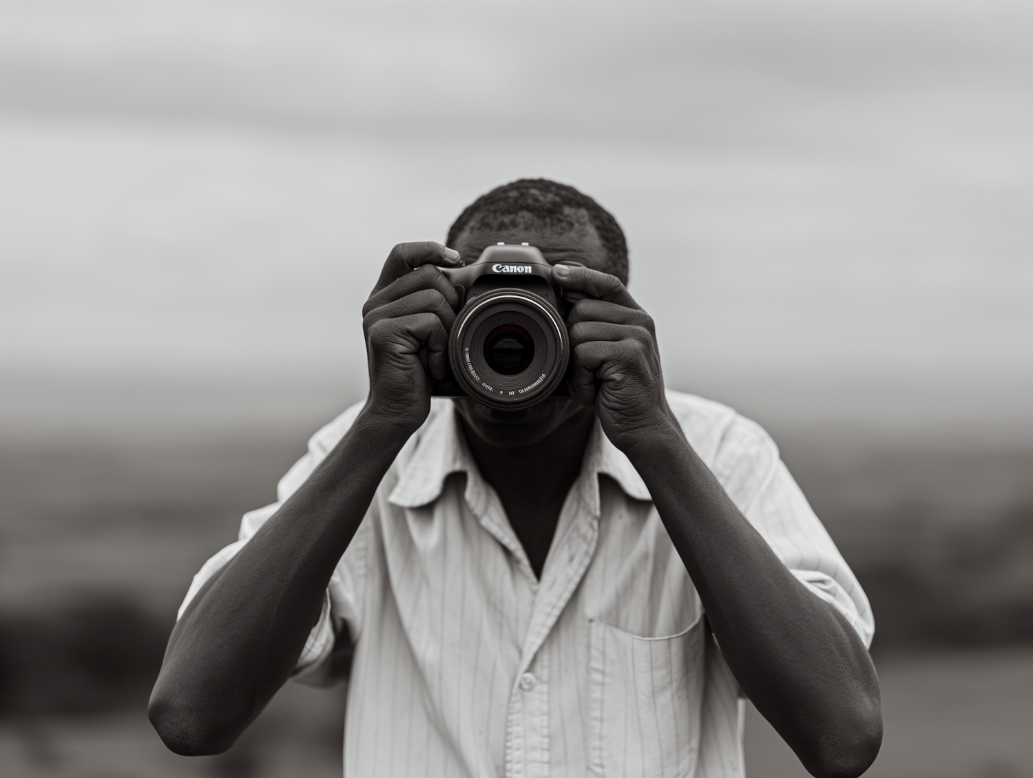 Black and white photo of a man taking a picture with a Canon camera, wearing a light shirt, outdoors.