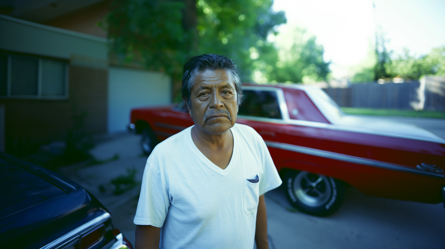Older Hispanic man in white T-shirt stands by a classic red car in a suburban driveway, with a serious expression.