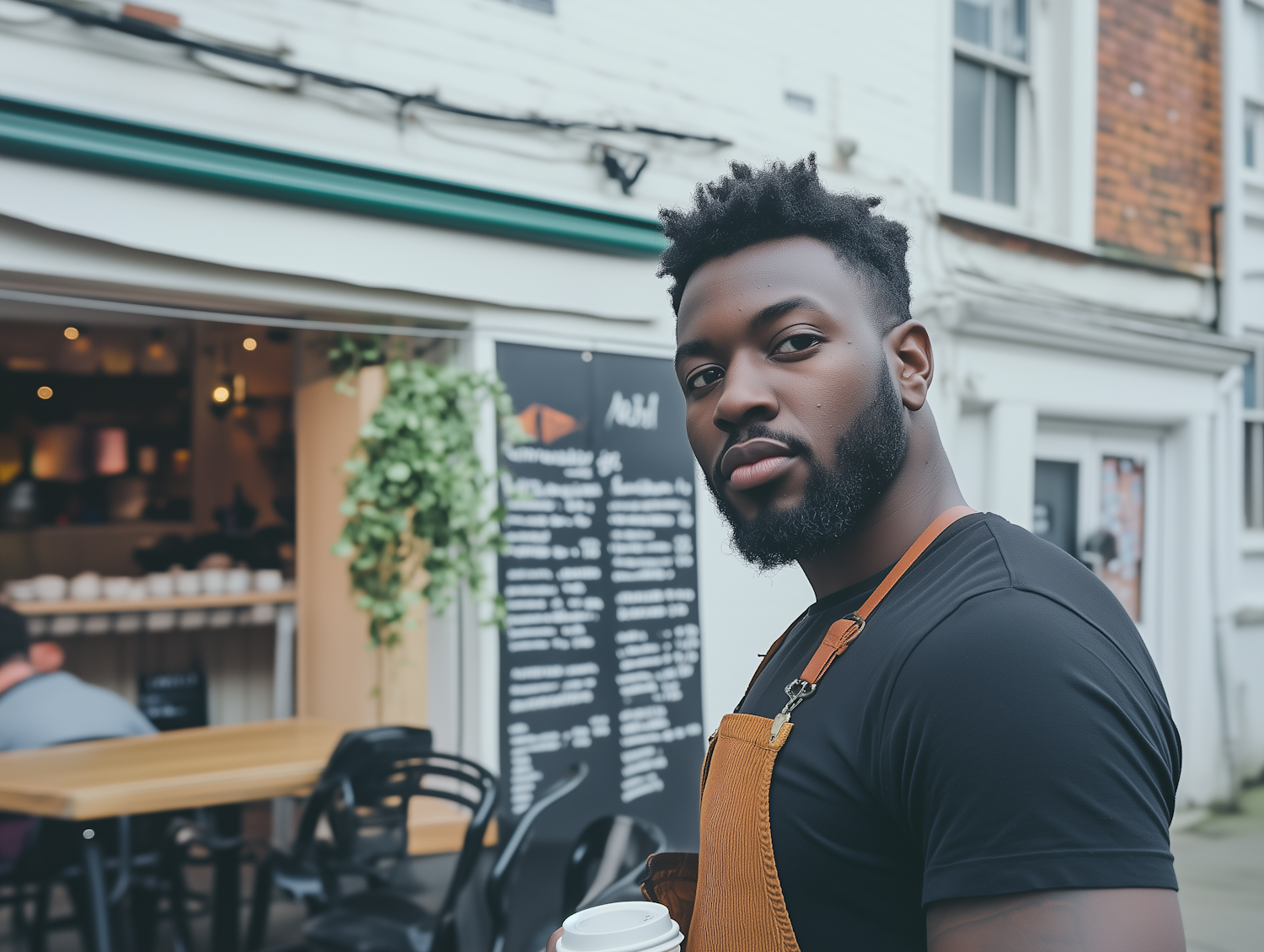 Confident barista with a beard holding a coffee cup outside a cozy café, wearing a black t-shirt and brown apron.