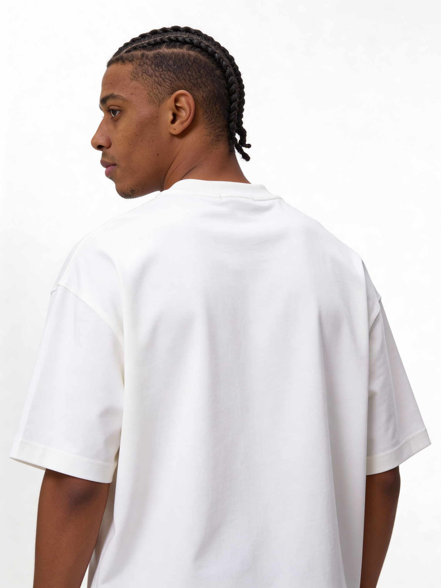 A man with cornrows wearing a white shirt, captured from a side and back angle against a plain white background.