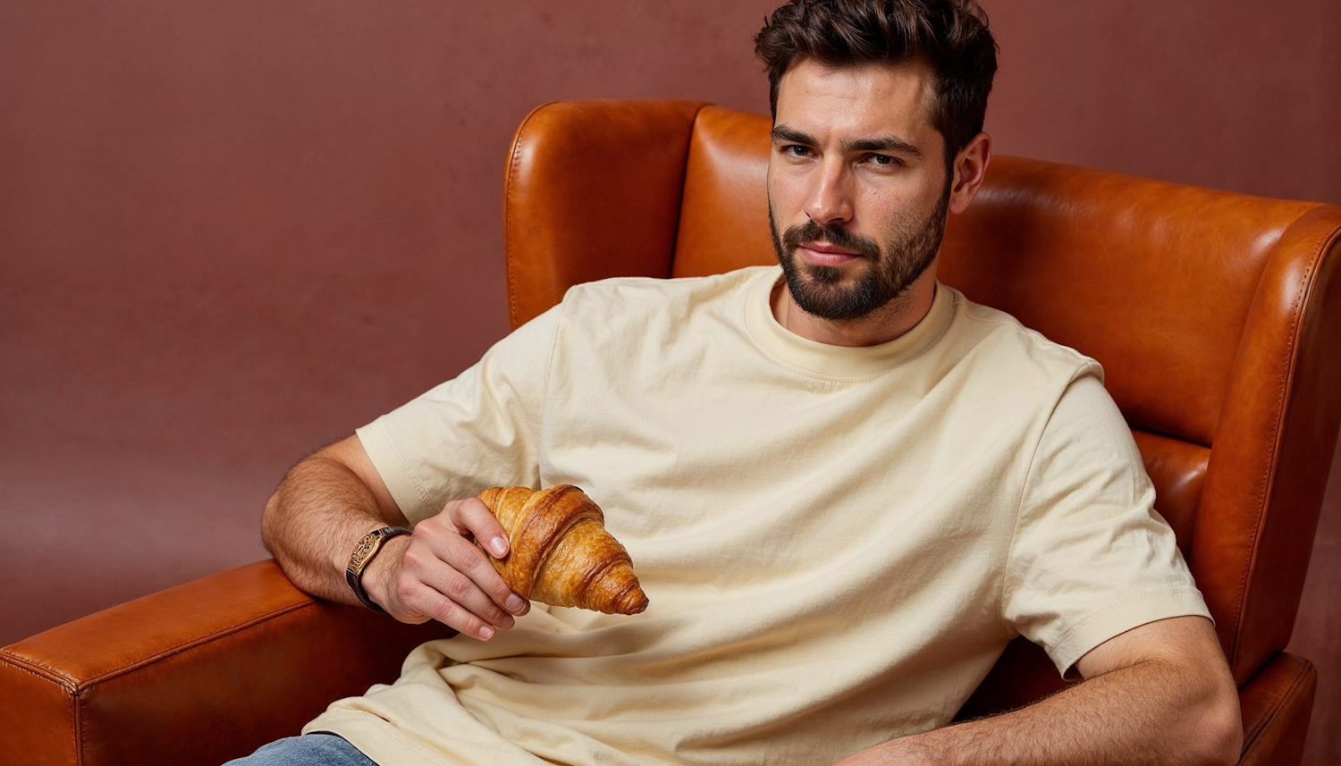 Man in a cream t-shirt holding a croissant, seated in a caramel leather chair with a warm brown background.