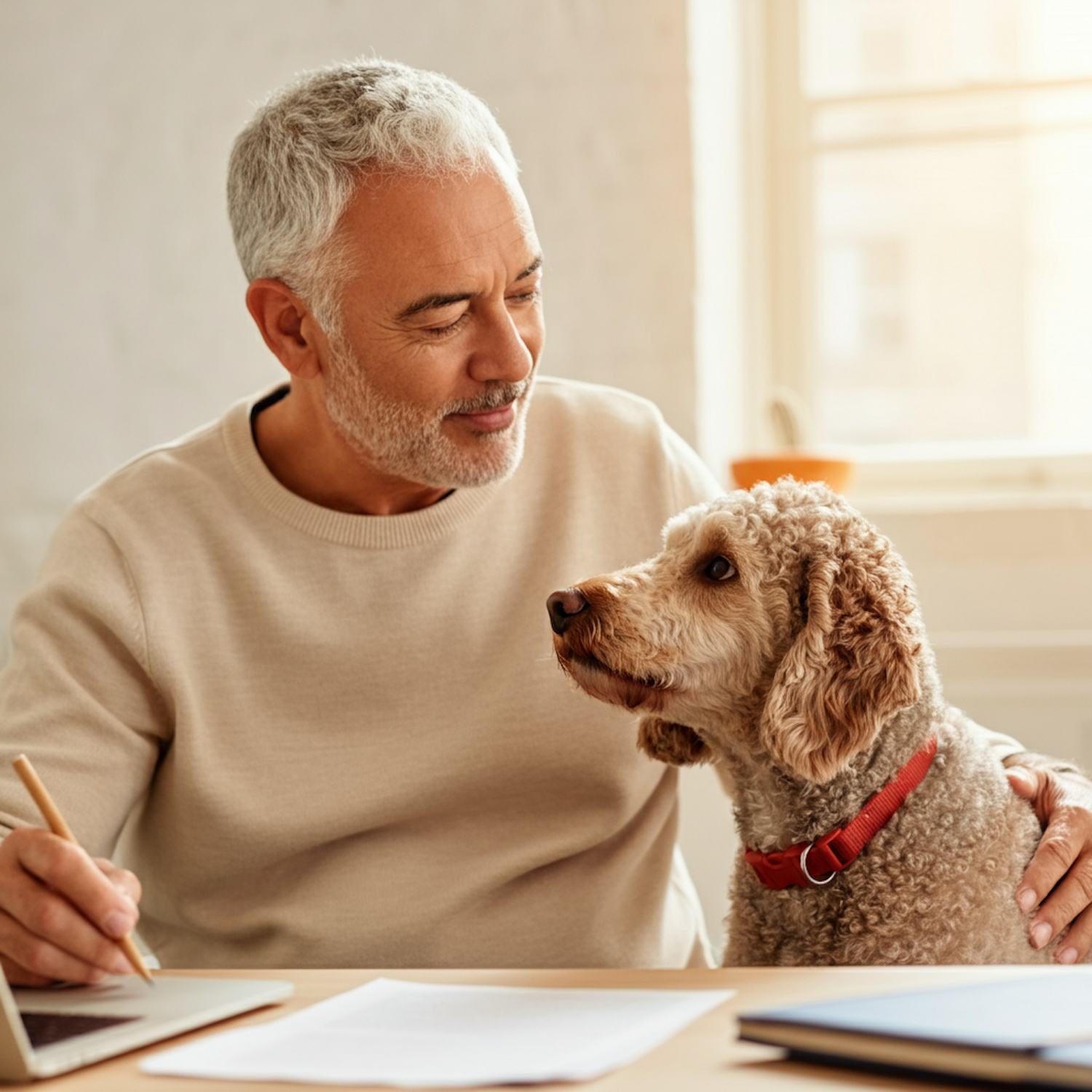 Middle-aged man with gray hair and beard working at desk, interacting with a curly-haired dog wearing a red collar in a cozy setting.